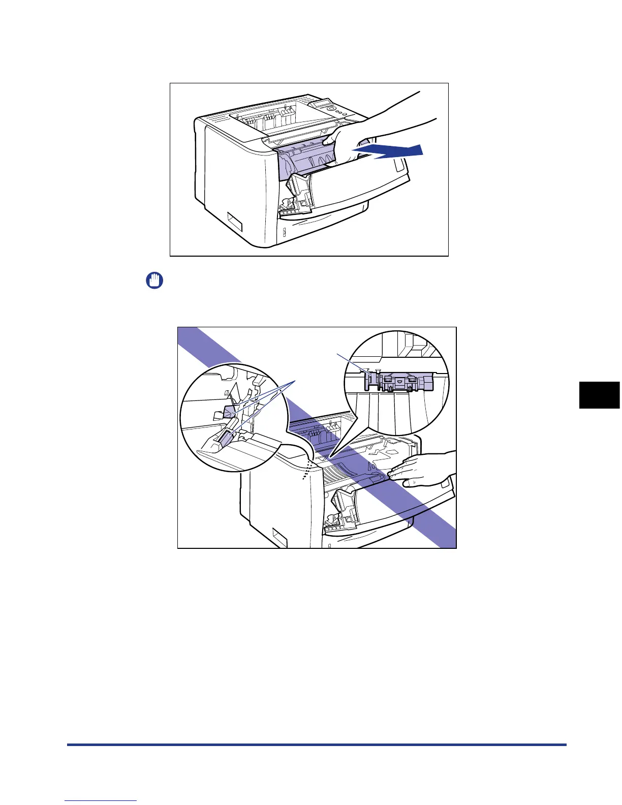 Be sure not to touch the high-voltage contacts (A) or electrical contact (B) shown in