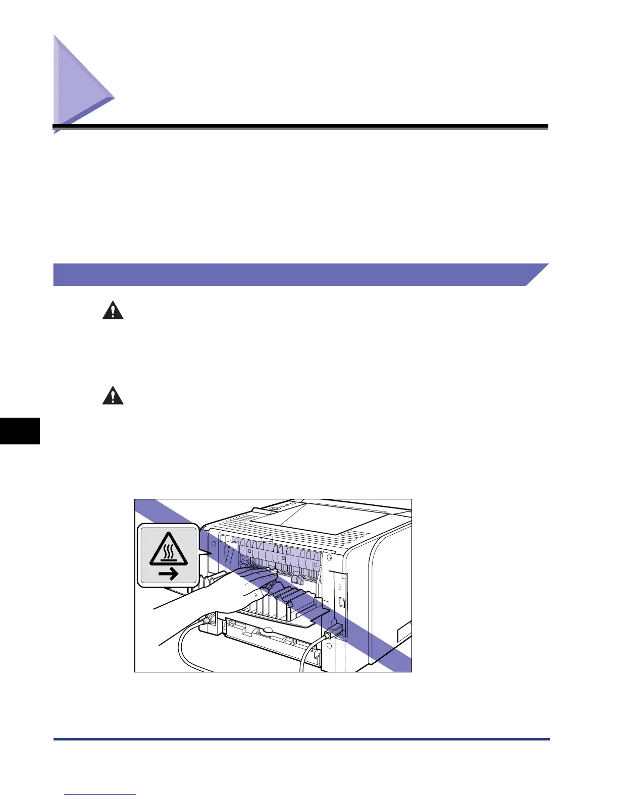 • The fixing unit and its surroundings inside the printer are hot during use. Make