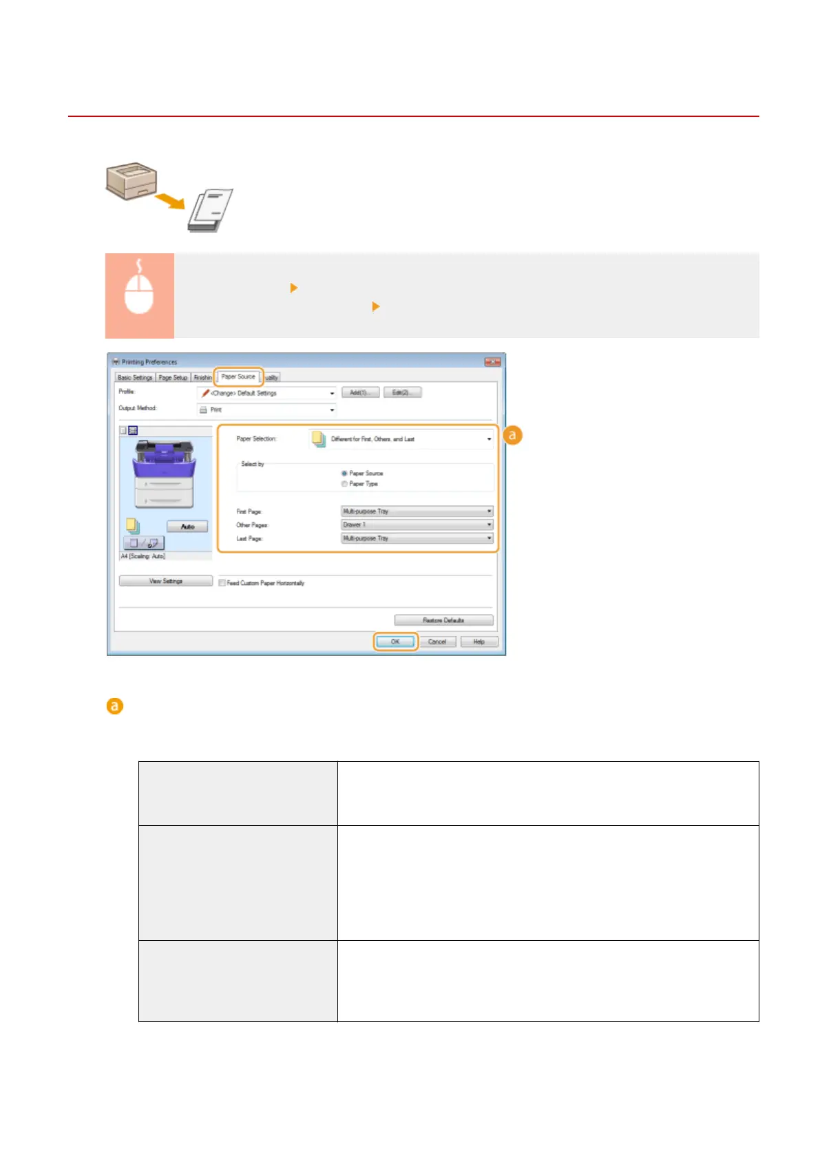 Specify which pages should be printed on different paper, and select which paper source should be used to