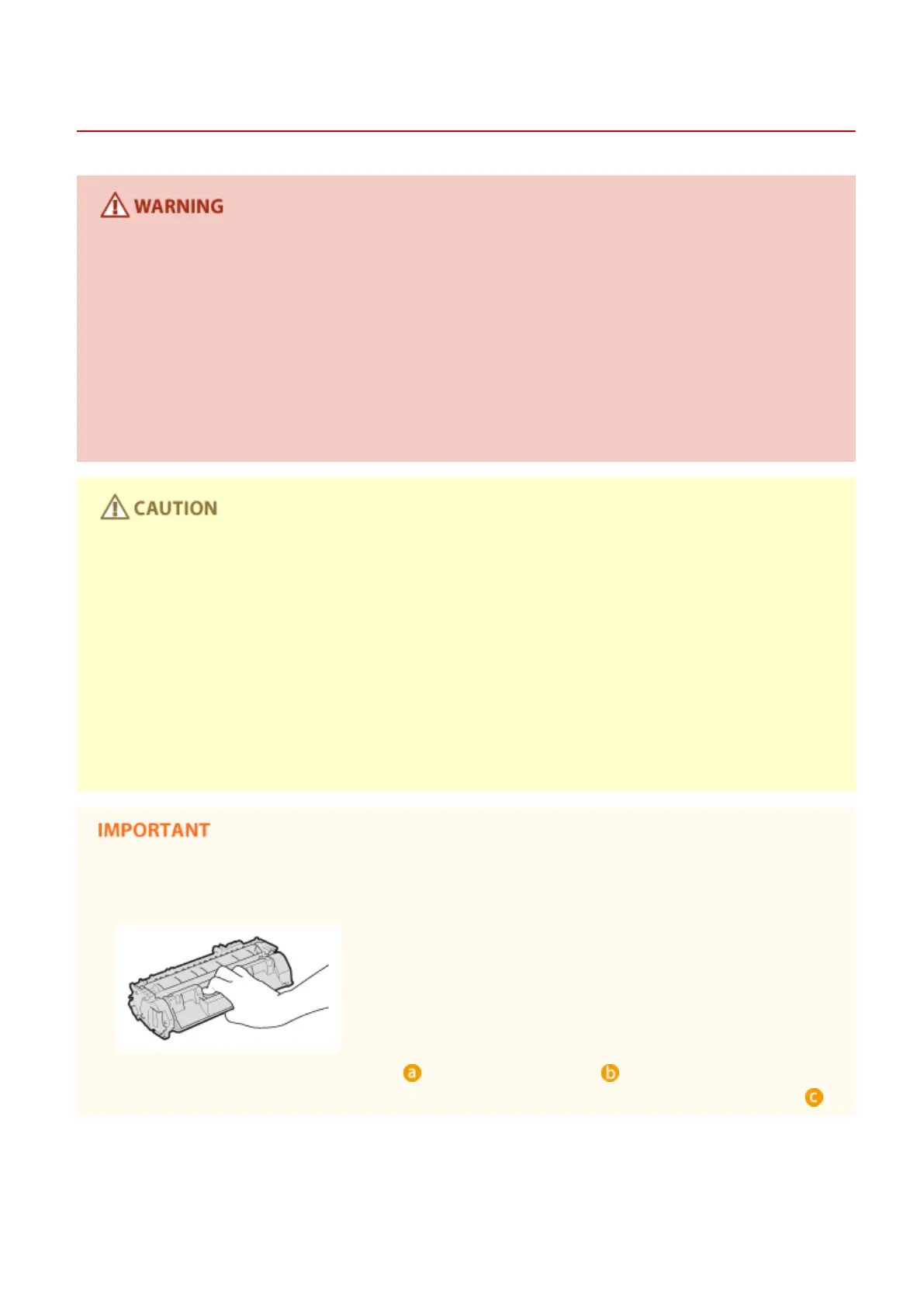 ● Use caution not to inhale any toner. If you should inhale toner, consult a physician immediately.
