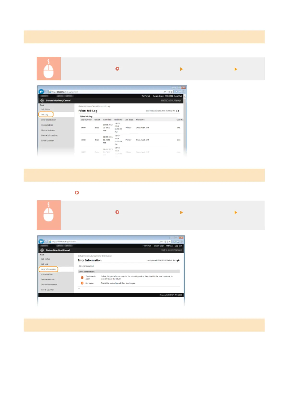 Log on to the Remote UI ( Starting Remote UI(P. 270) ) [Status Monitor/Cancel] [Job Log]