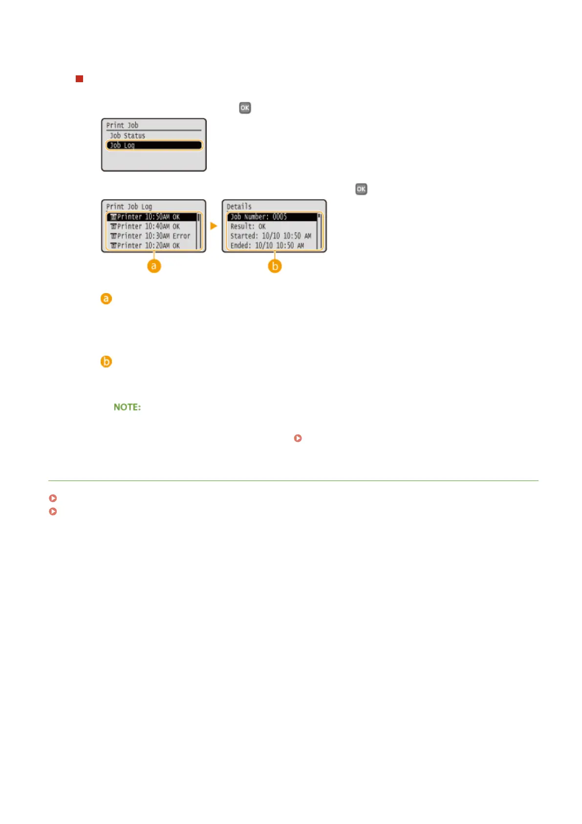 Displays a list of the documents that were printed. <OK> is displayed when a document was printed