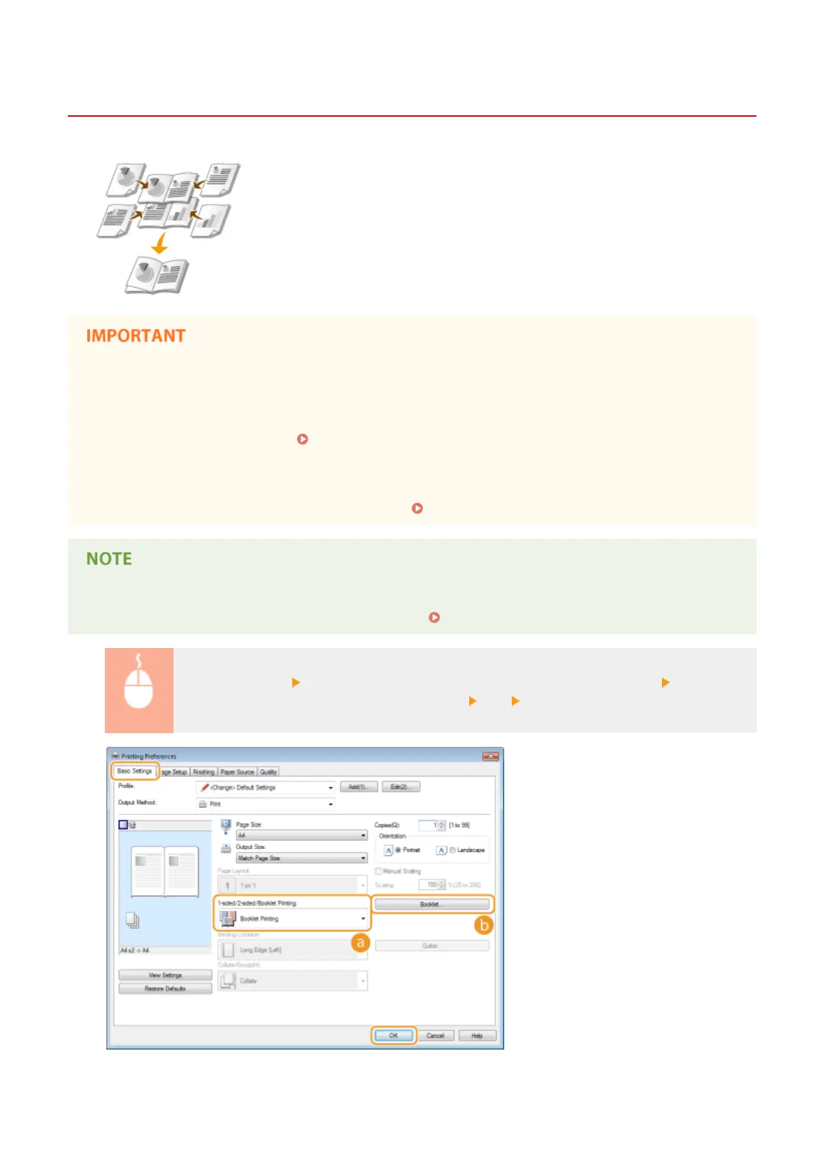 [Basic Settings] tab Select [Booklet Printing] in [1-sided/2-sided/Booklet Printing] Click