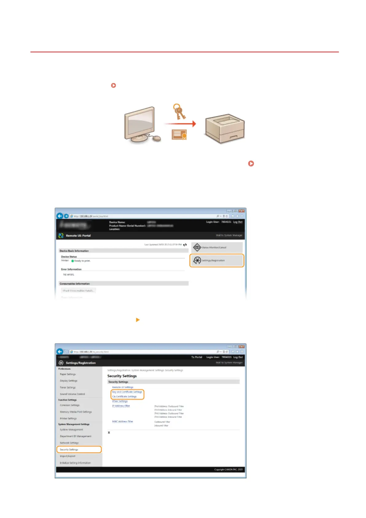 ● Click [Key and Certicate Settings] to install a key pair, or [CA Certicate Settings] to install a CA certicate.
