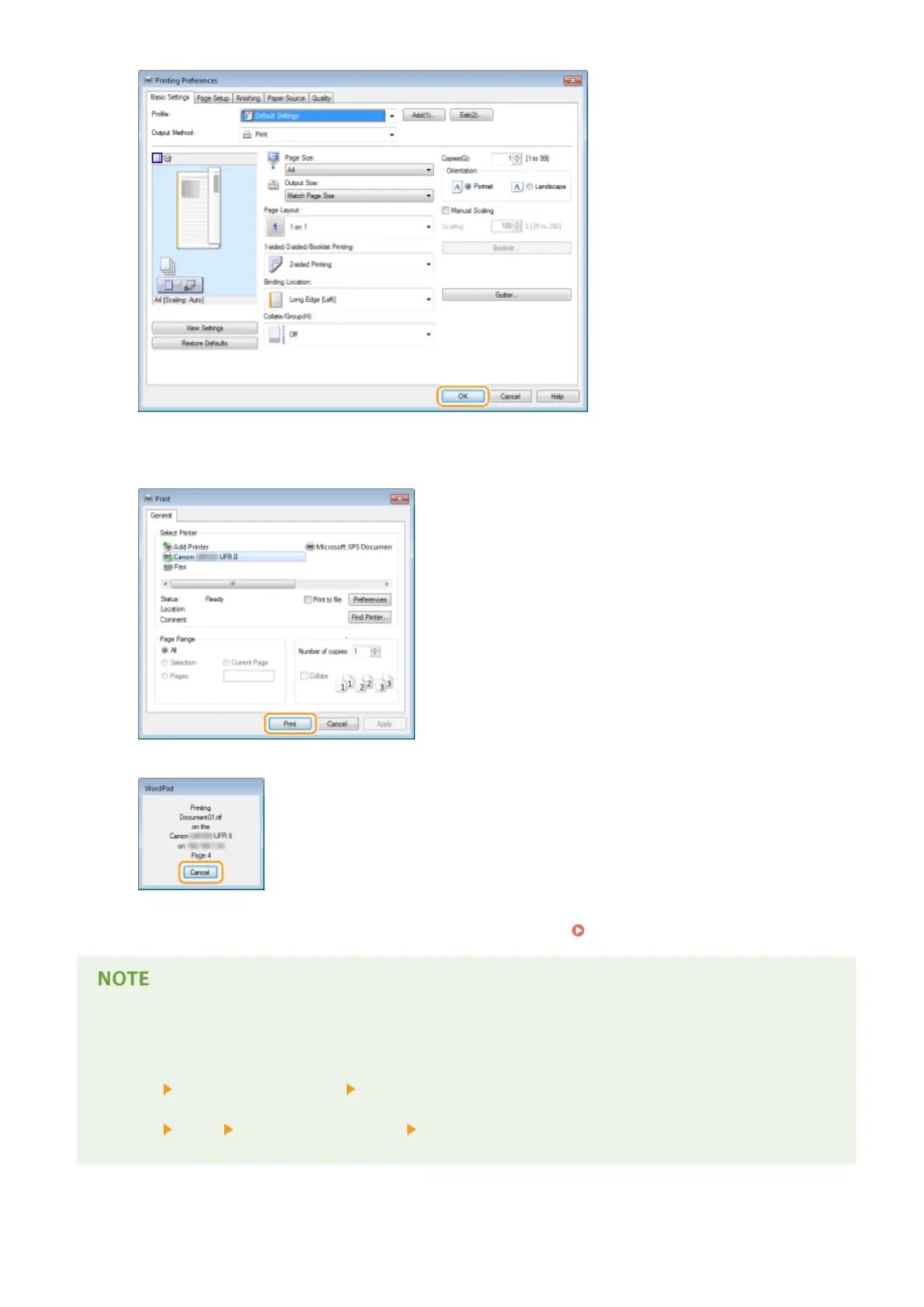 ● To cancel printing, click [Cancel] when the screen shown above is displayed. After the screen disappears or if