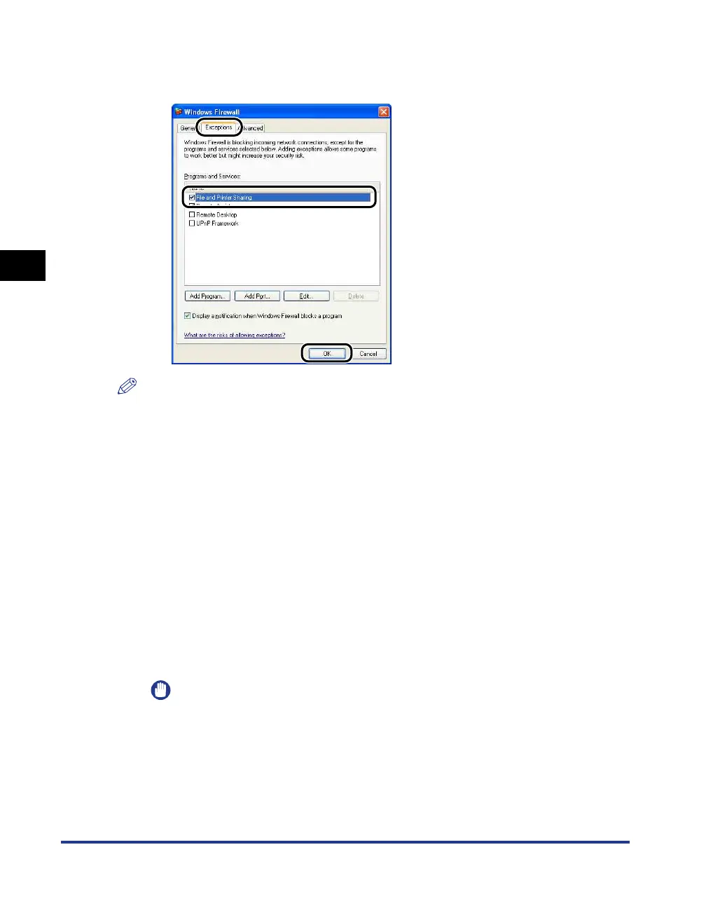 2. On the [Exceptions] sheet in the [Windows Firewall] ([Windows Firewall Settings]