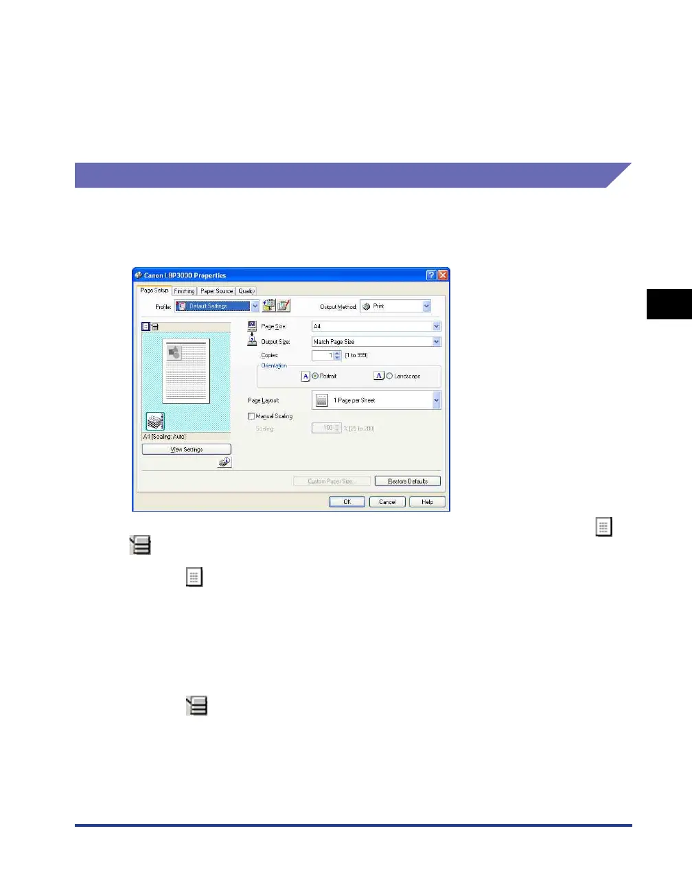 The preview panel on the [Page Setup], [Paper Source], and [Finishing] sheets