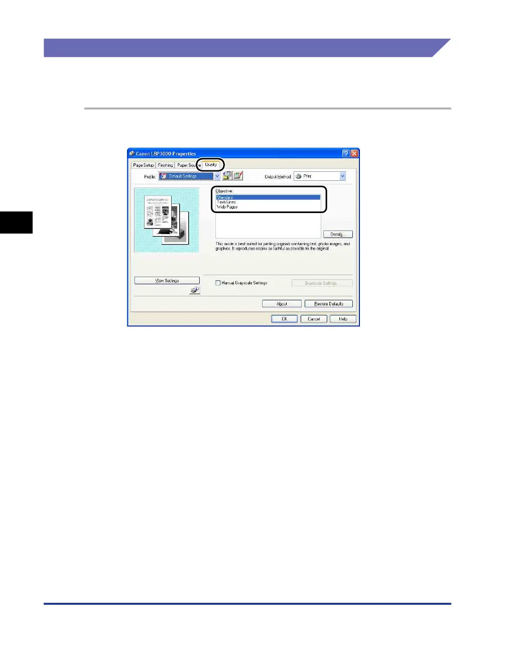Display the [Quality] sheet, then select the [Objective] setting.