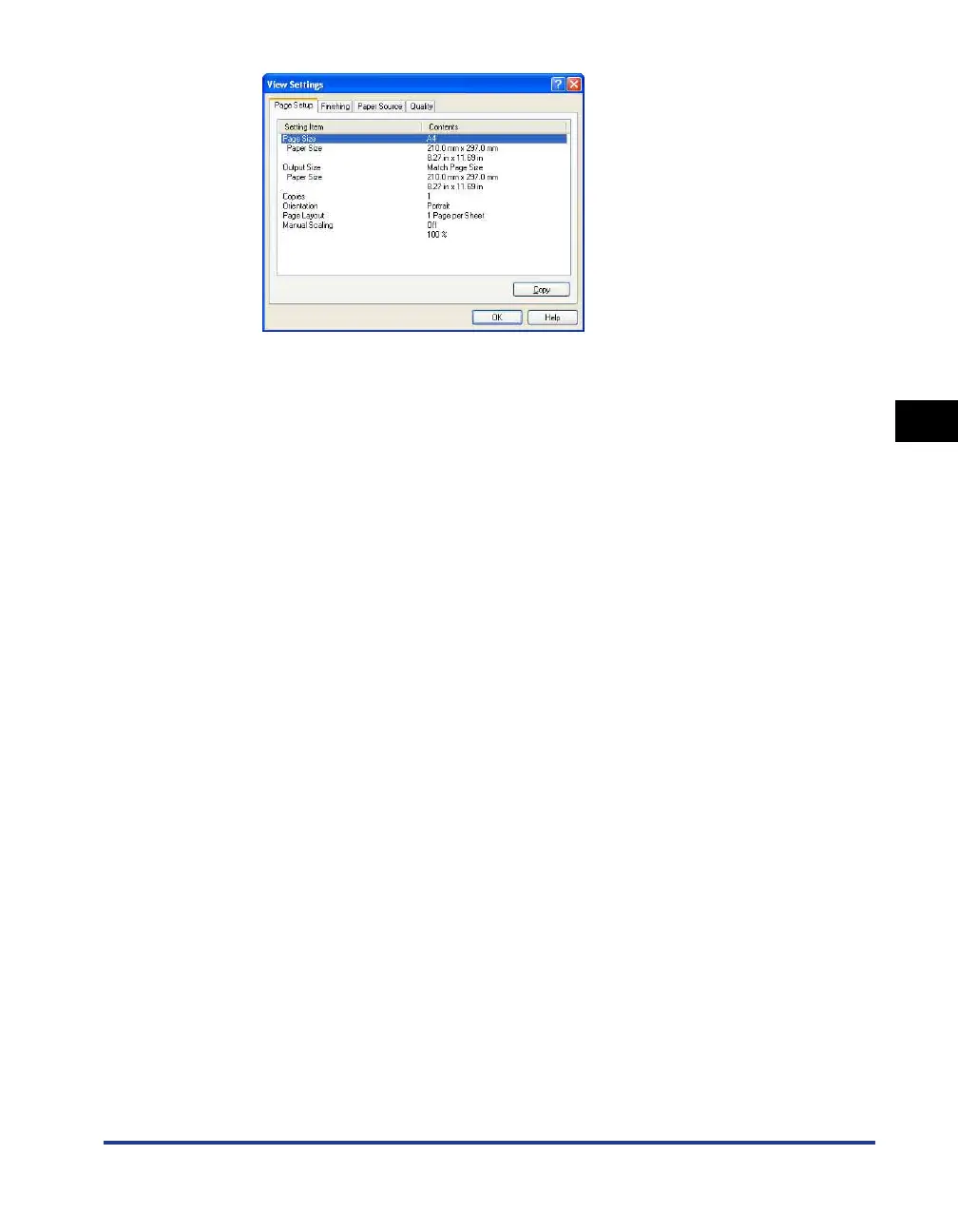The settings in the [Page Setup], [Finishing], [Paper Source], [Quality] and