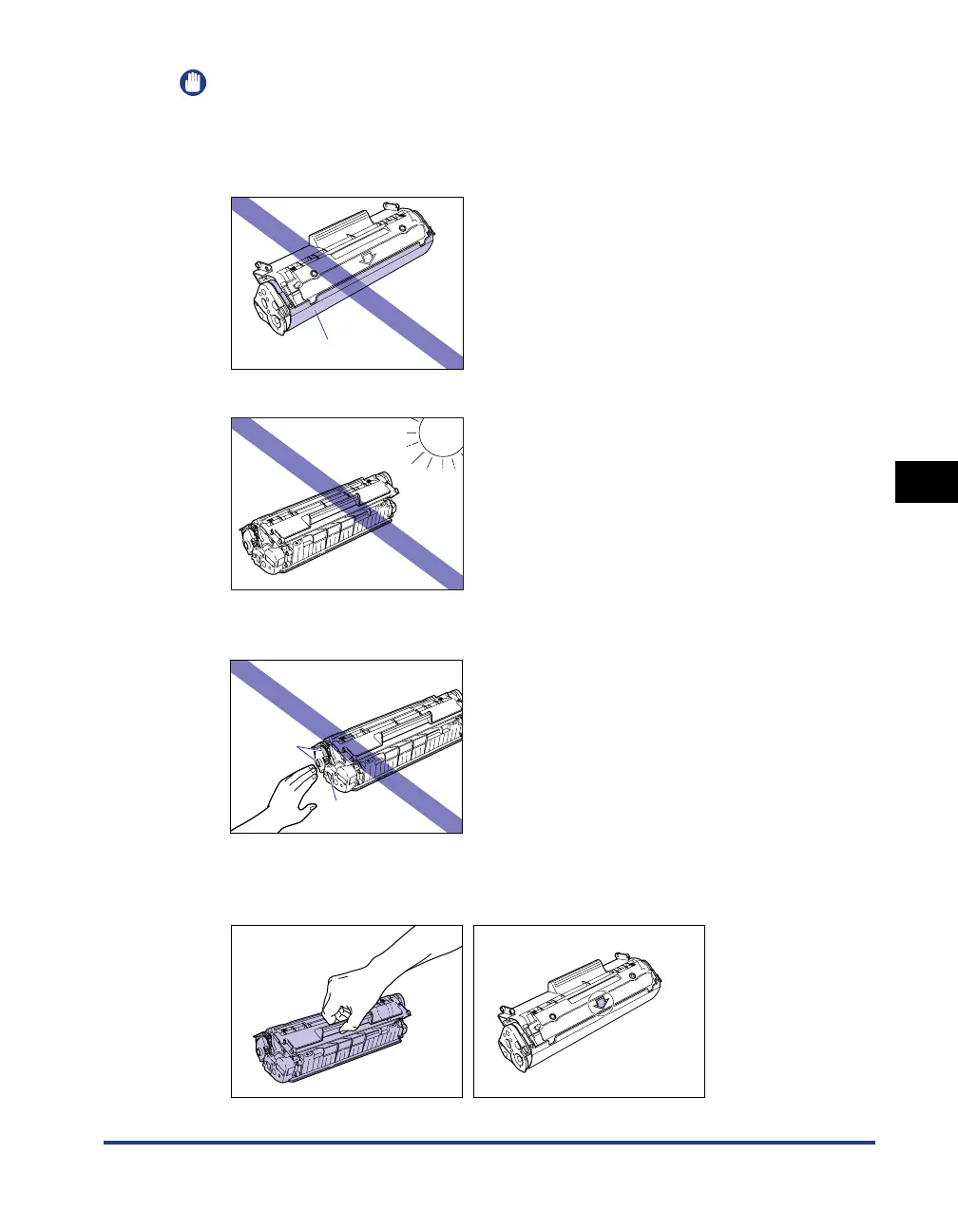 Whenever you are handling the toner cartridge, hold it as shown in the diagram, and