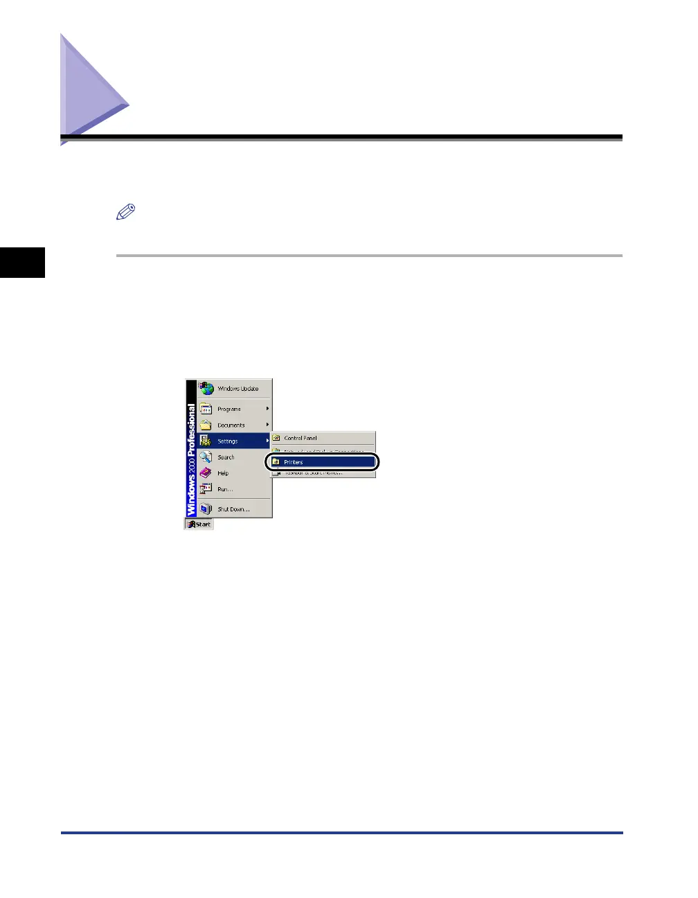 For Windows 98/Me/2000: Click the [Start] menu ➞ [Settings] ➞ [Printers].