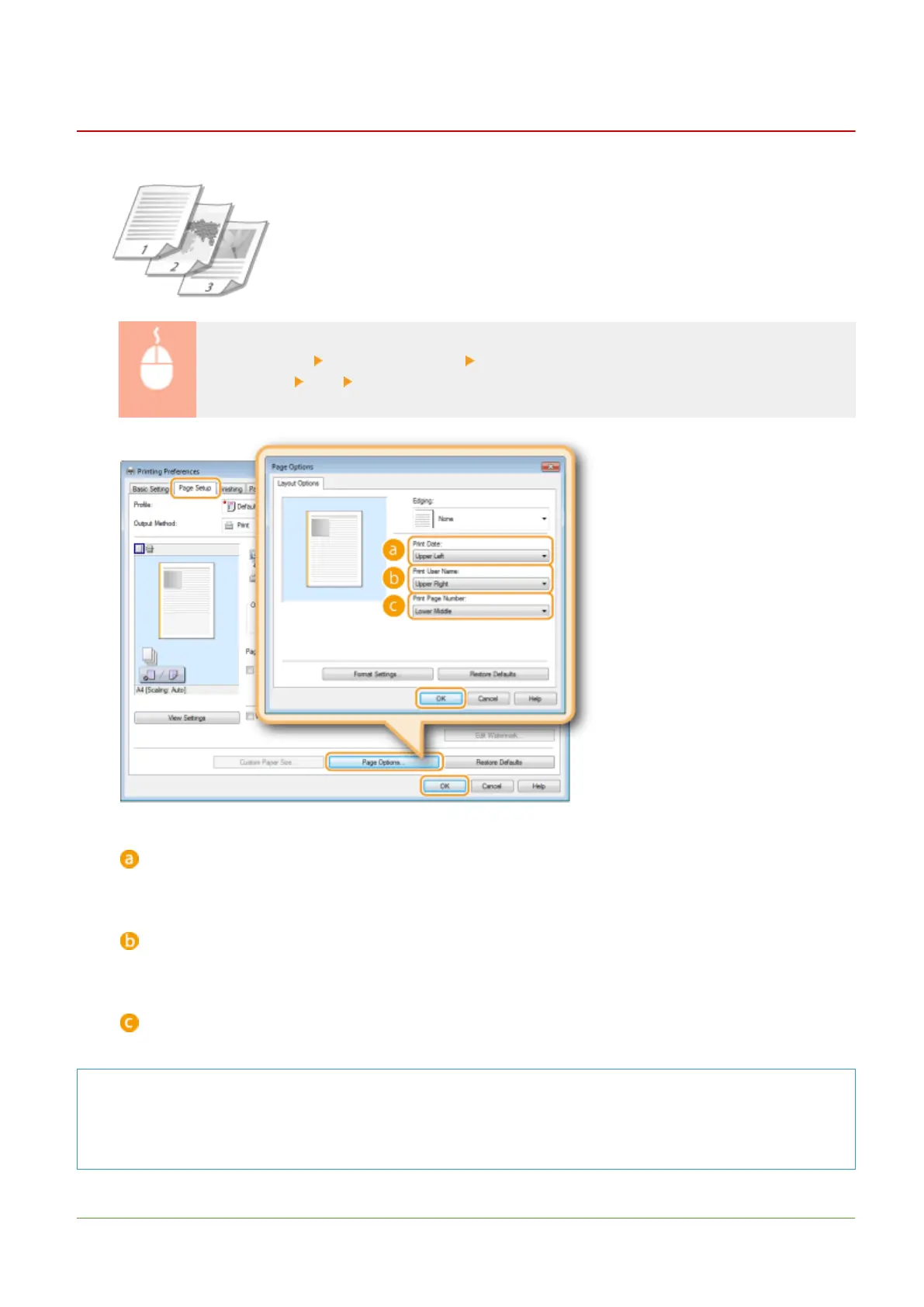 [Page Setup] tab Click [Page Options] Select the print position of the print date, user name or