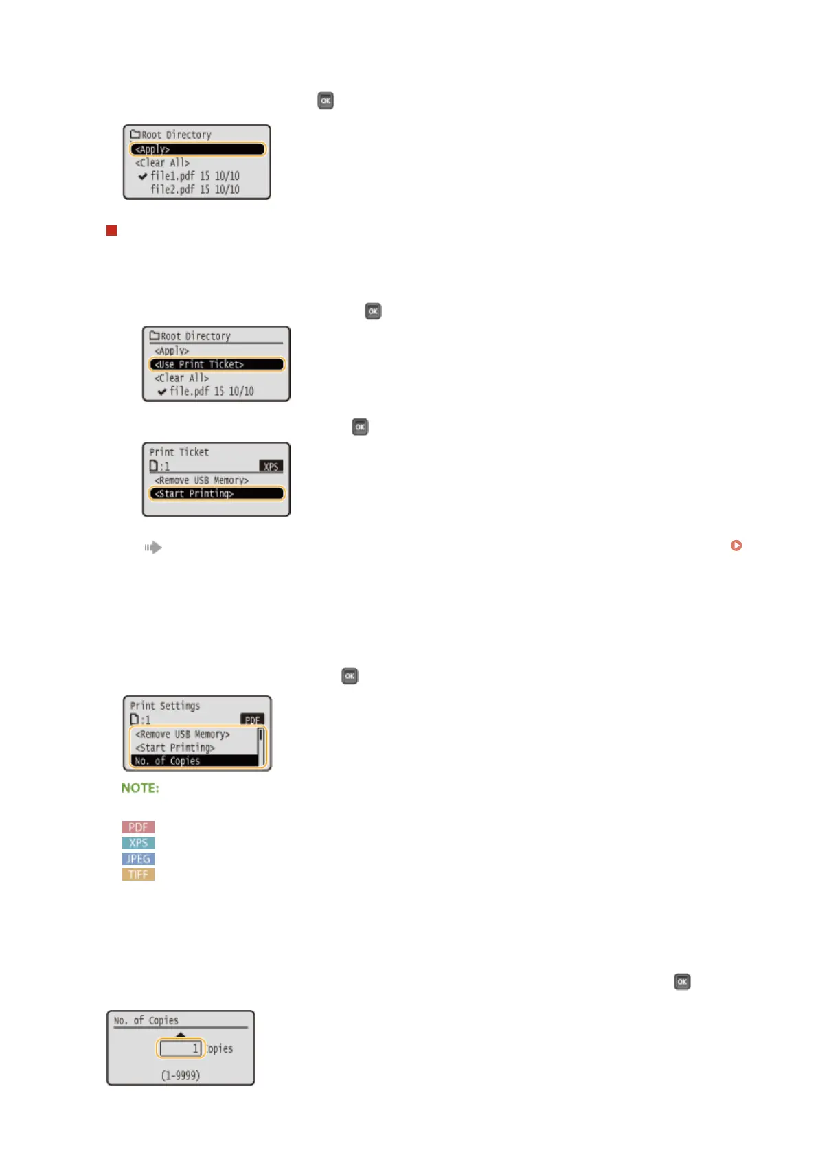 Printing starts. When the printing is nished, remove the USB memory device from the machine.