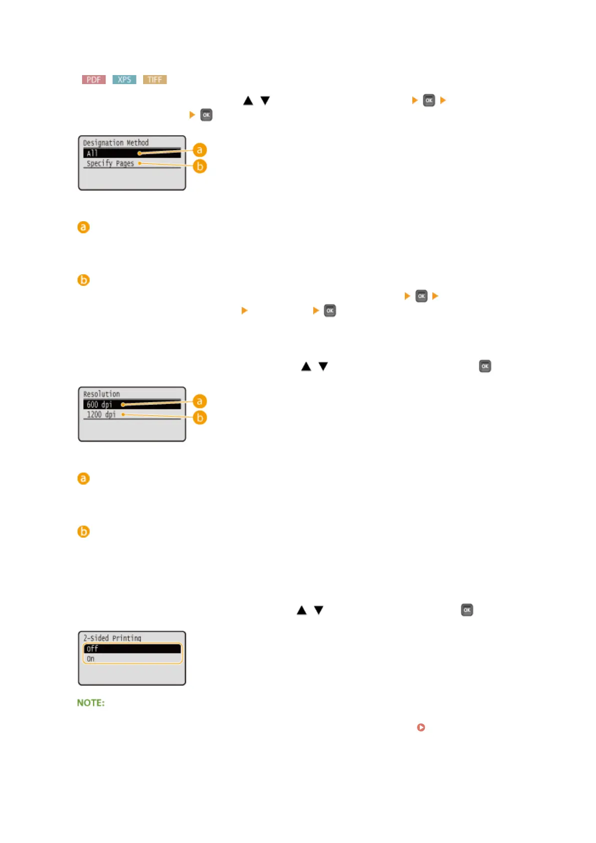Specify the range (pages) to print. Use / to select <Designation Method> select the method to