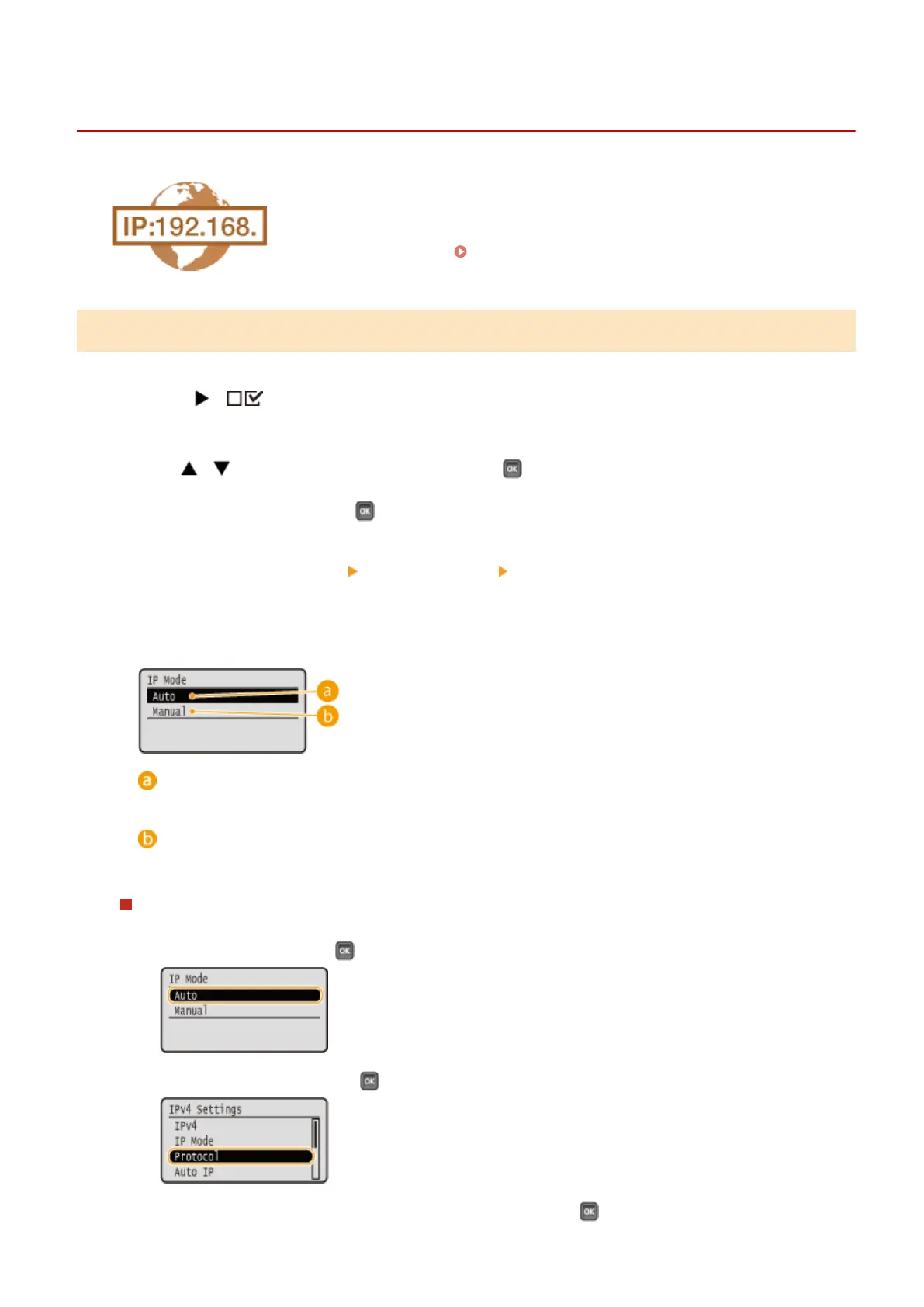 Select <TCP/IP Settings> <IPv4 Settings> <IP Mode>.