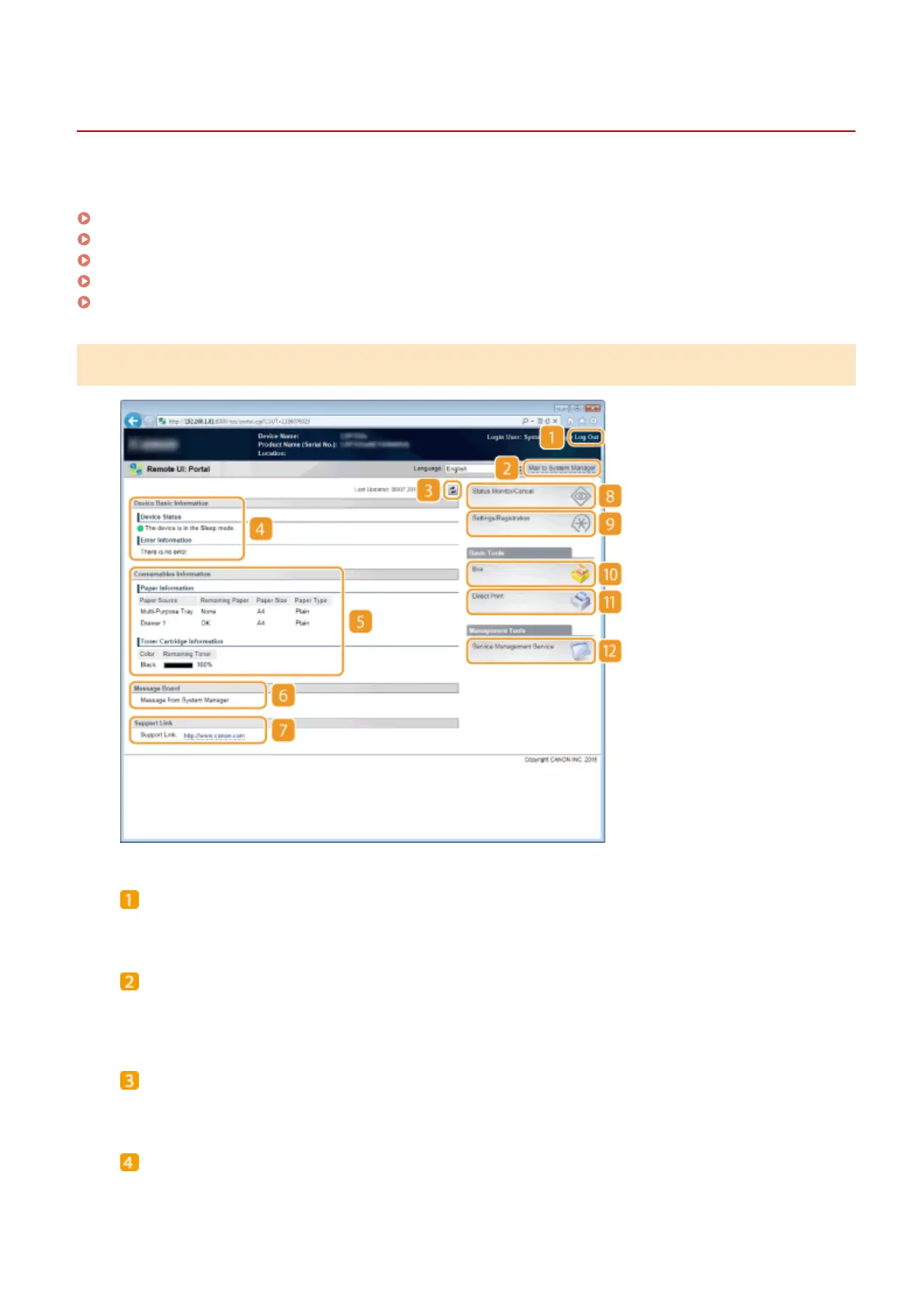 This section describes the typical screens of the Remote UI.