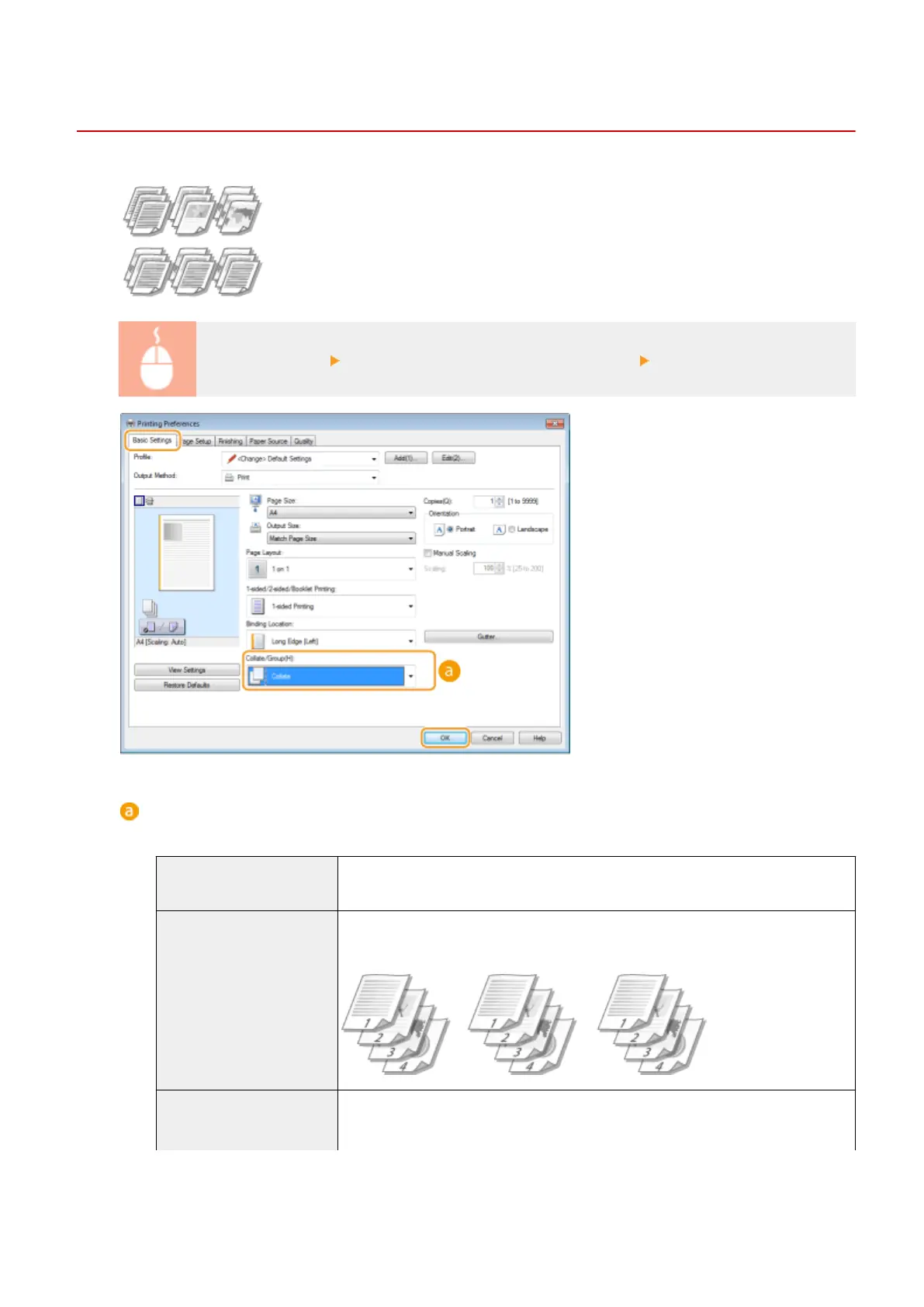 [Basic Settings] tab Select [Collate] or [Group] in [Collate/Group] [OK]