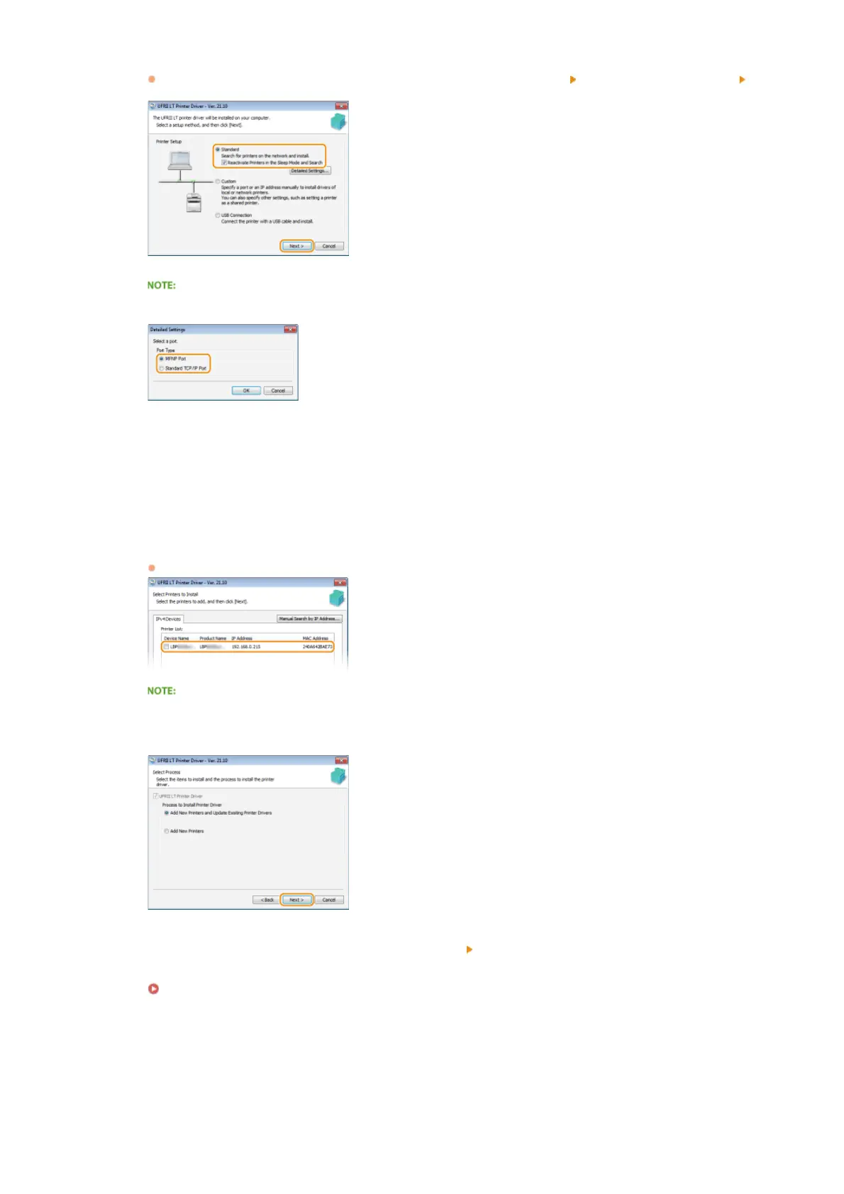 If a printer driver is already installed, the [Select Process] screen is displayed before the [Select Printers to