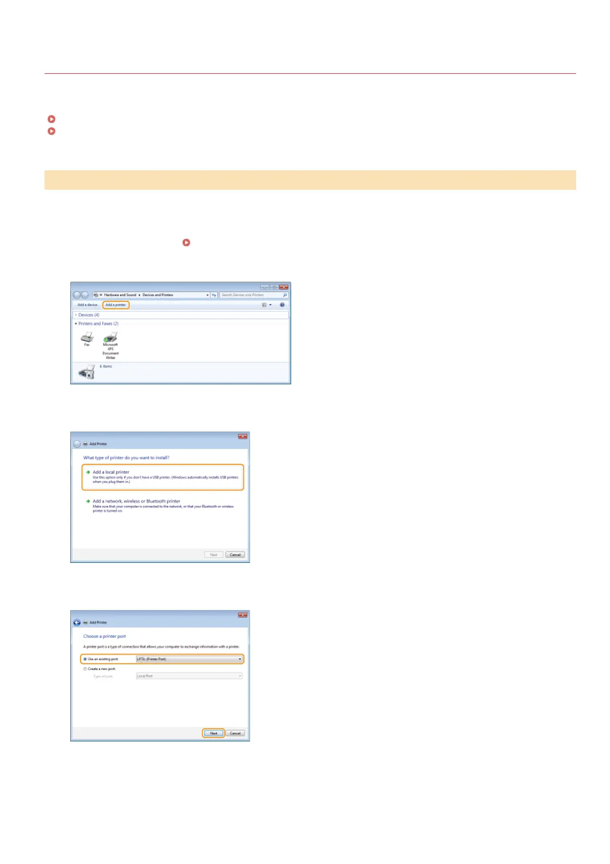 Check that [LPT1] is selected under [Use an existing port], and click [Next].