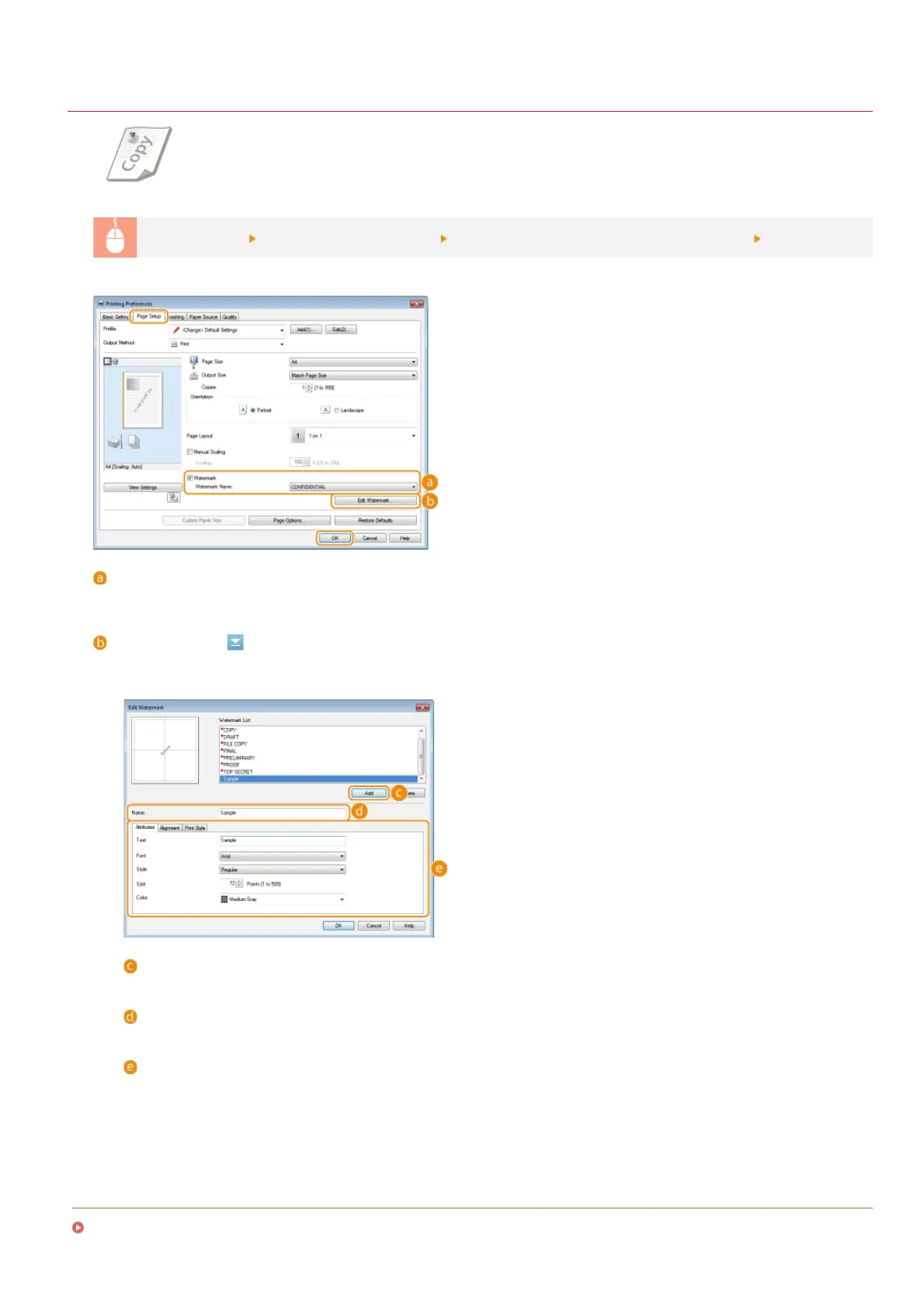Click each tab to specify the text, color, or print position of the watermark name. For more information about the