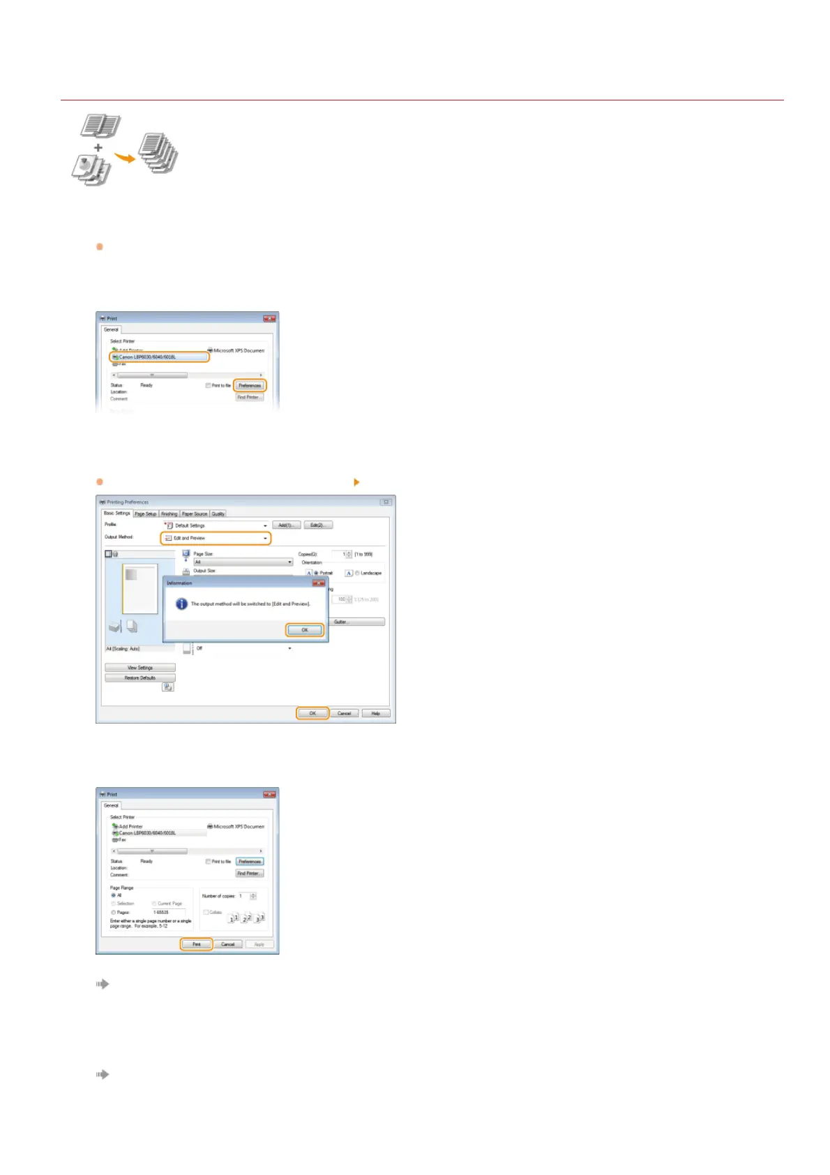 By using Canon PageComposer, you can combine multiple documents into one print job and print the job with