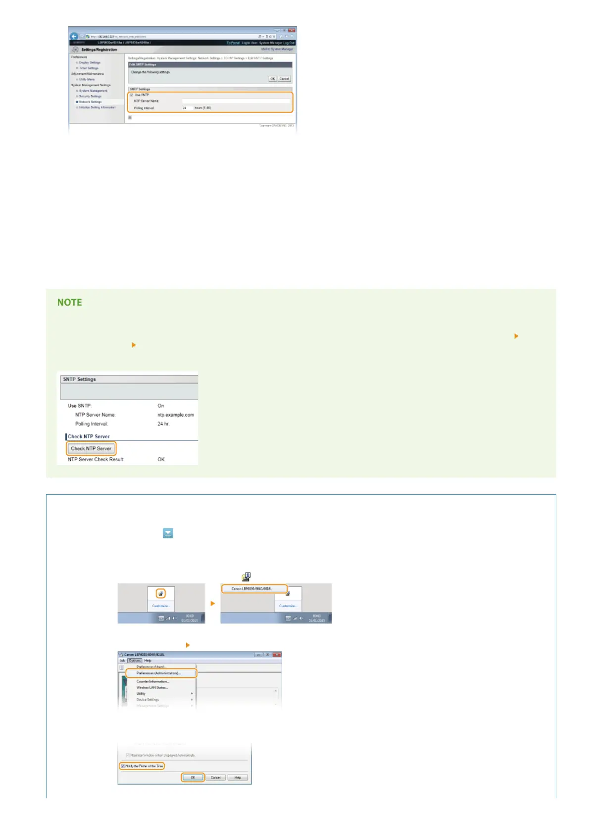 [Network Settings] [TCP/IP Settings] to display [SNTP Settings], and then click [Check NTP Server]. If a proper connection has