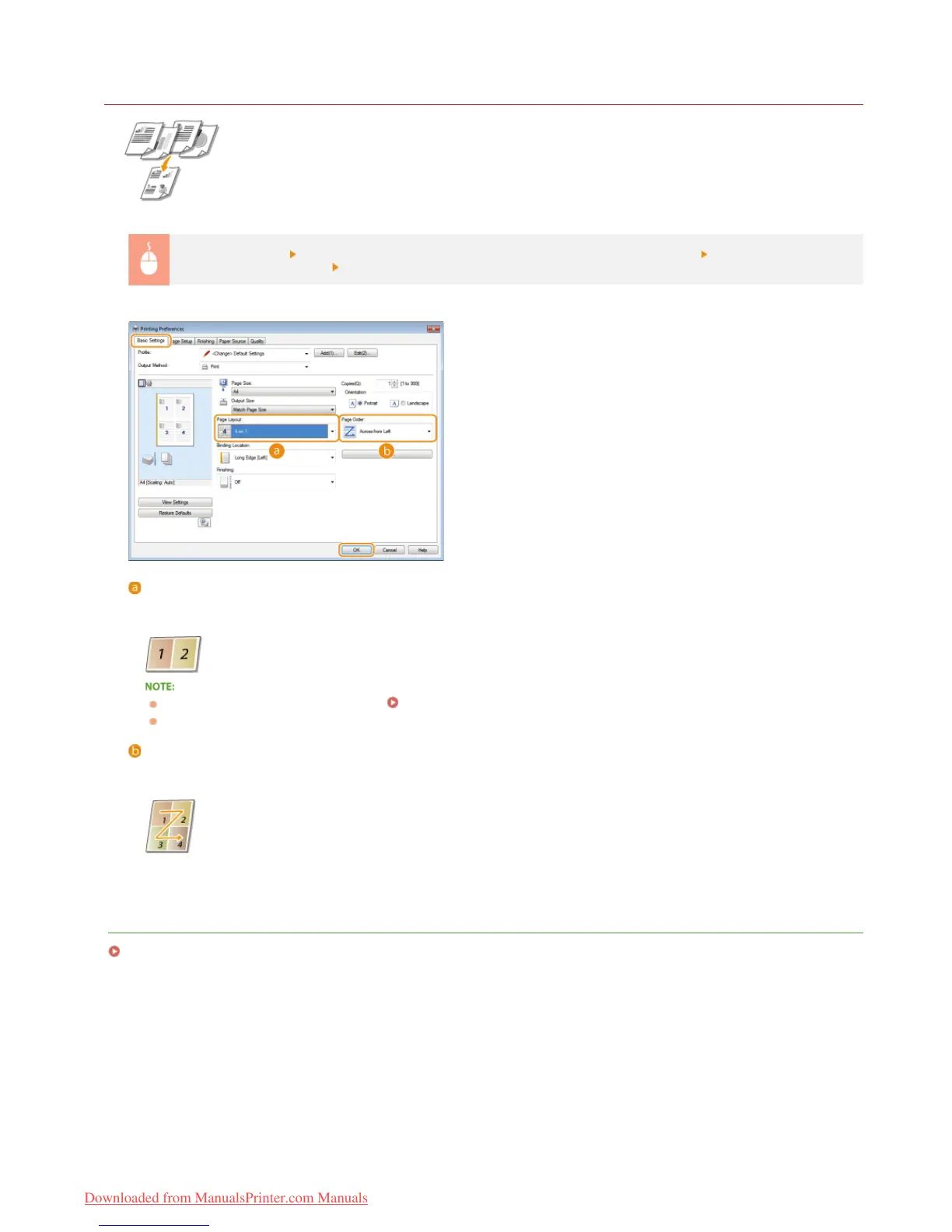 In [Page Layout], select the number of page to print onto a single sheet In [Page Order], select
