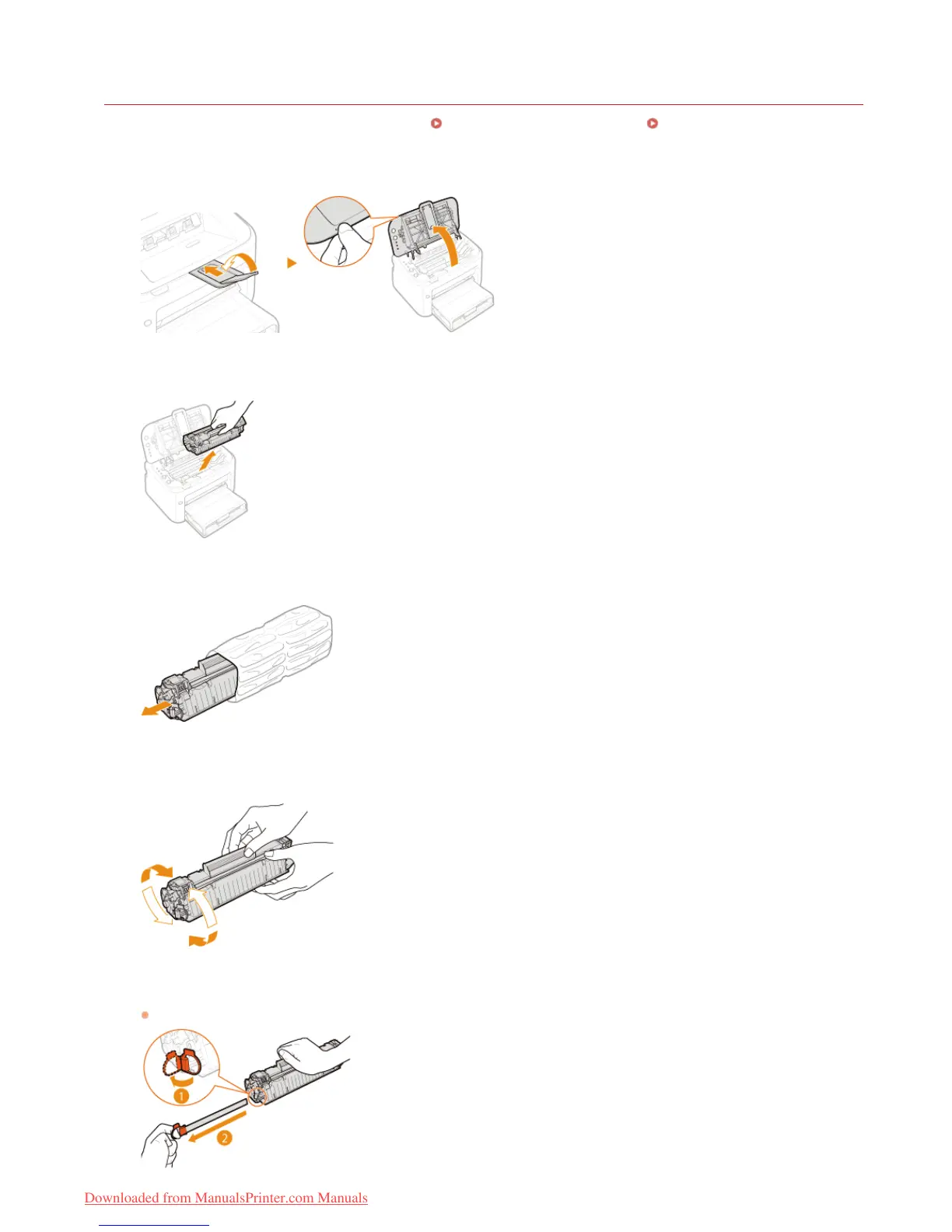 Shake the toner cartridge 5 or 6 times as shown below to evenly distribute the toner inside the cartridge,