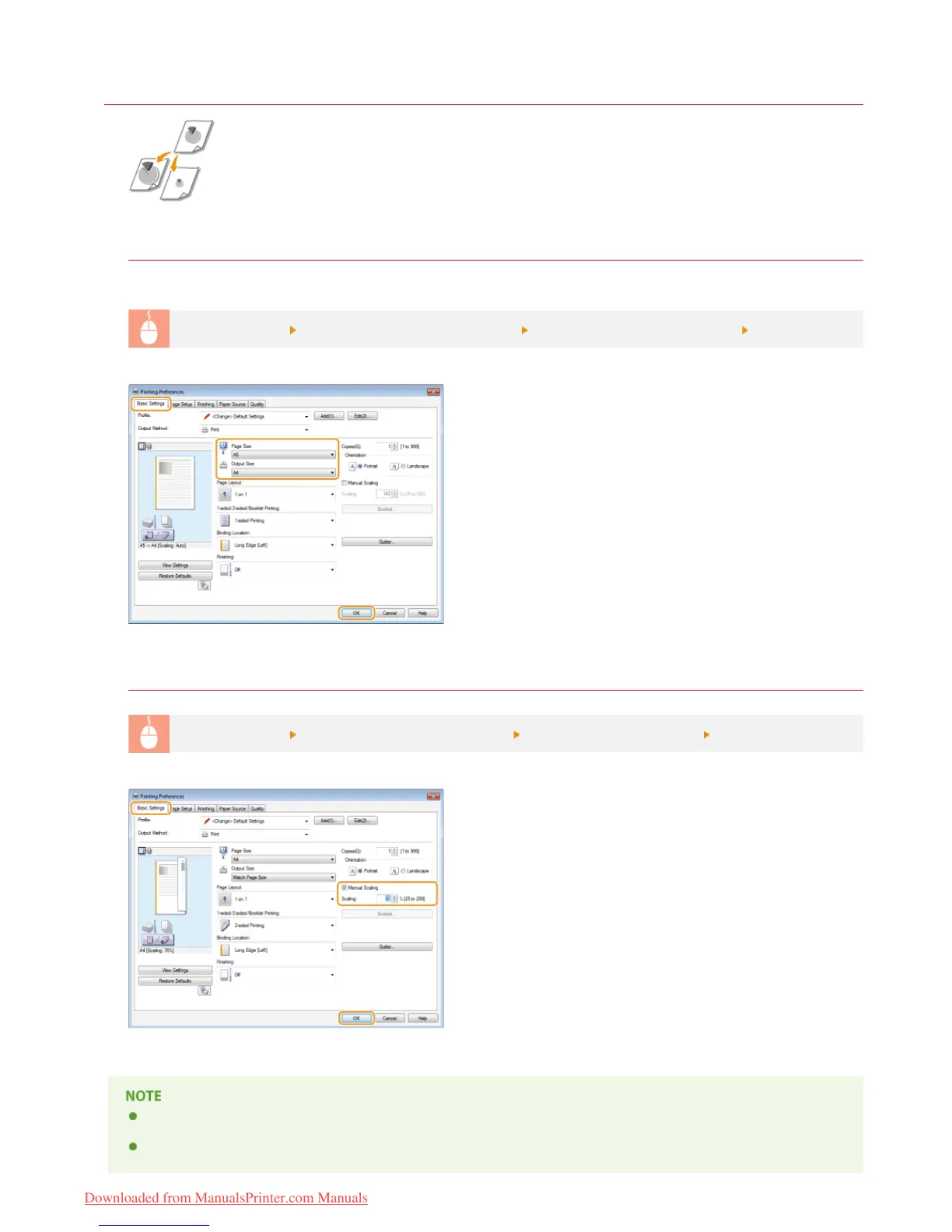 Select the document size in [Page Size] Select the paper size in [Output Size] [OK]