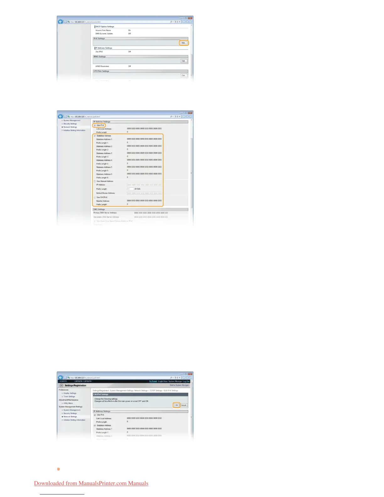 When you want to enter an IPv6 address manually, select the check box and enter values in the [IP Address], [Prefix Length],