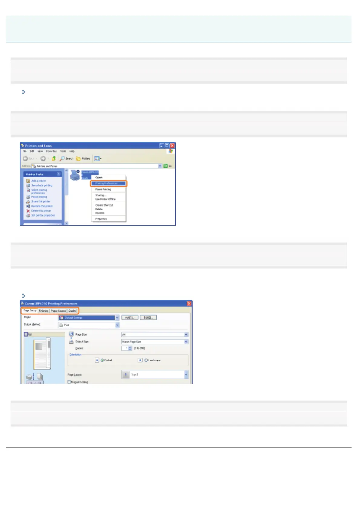 Change the printing preferences in the [Page Setup], [Finishing], [Paper Source], and [Quality] sheets.