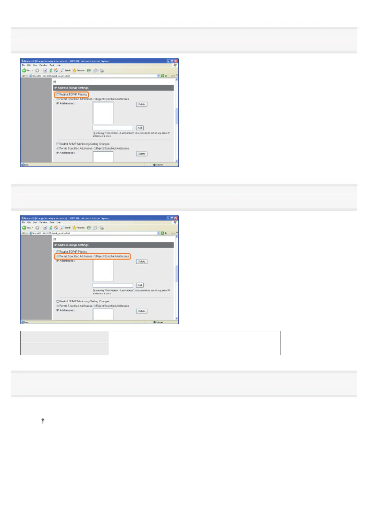 [Permit Specified Addresses] Only users specified in [IP Addresses] can perform printing.