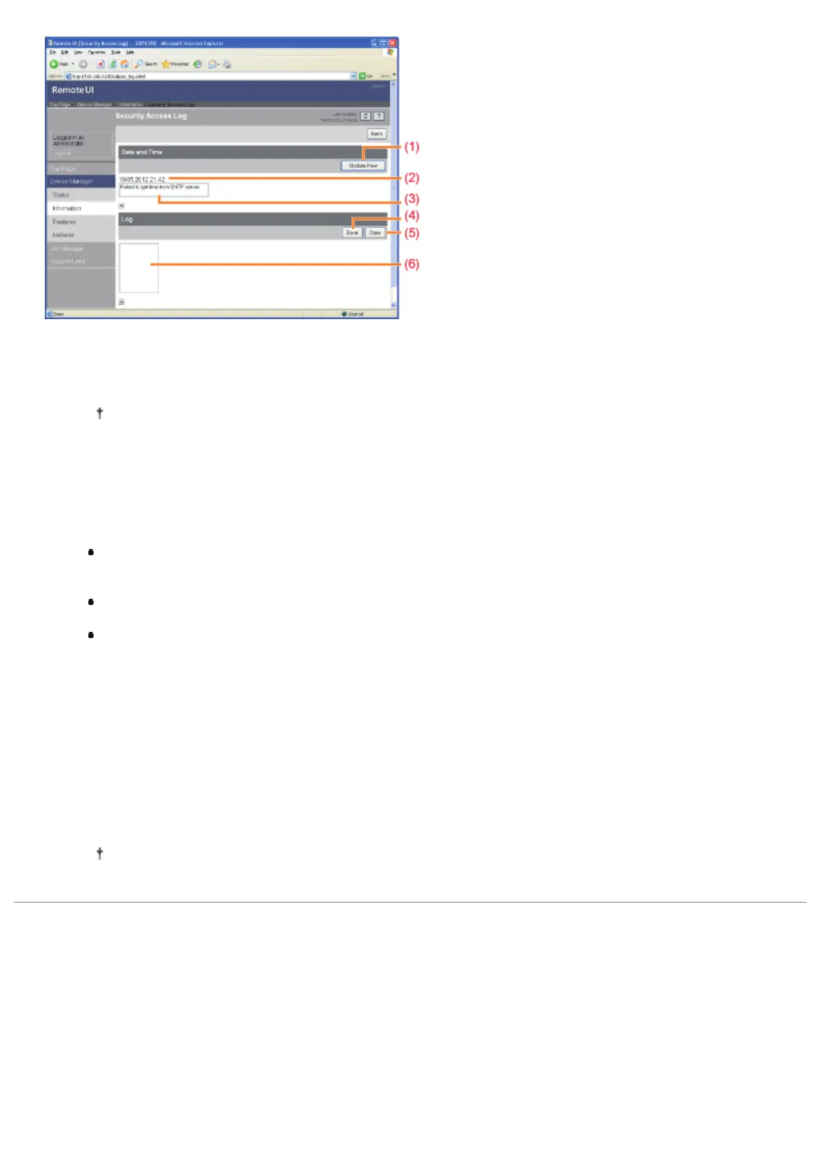 Reflects the obtained status to [Date and Time] and [SNTP Server Log] according to success or failure of obtaining