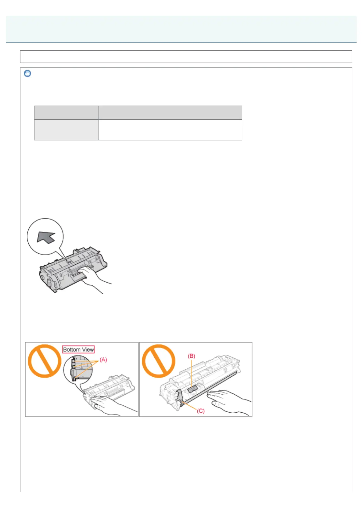 When handling the toner cartridge, hold it properly with the arrowed side facing up as shown in the figure. Do not place it