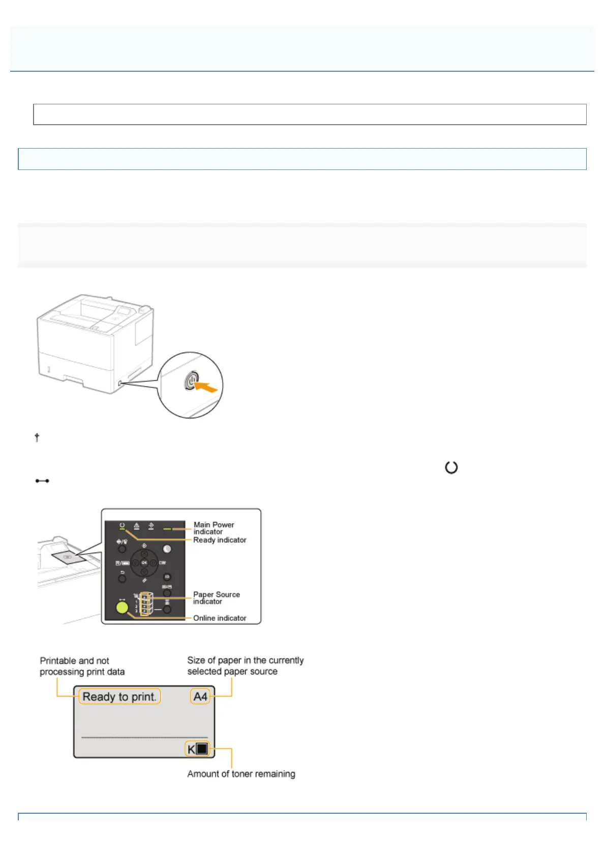 (Online) indicator (green) and Paper Source indicator (green) come on, <Ready to print.> appears in the display, and
