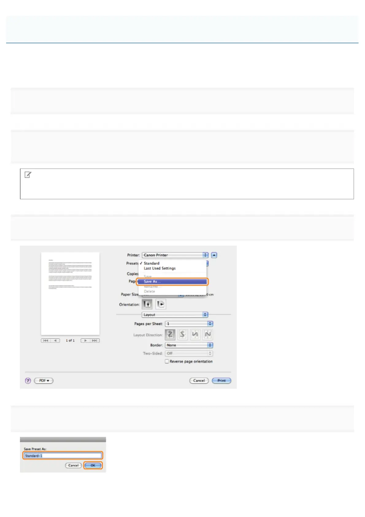 You can save print settings that you specified in each preferences pane of the [Print] dialog box use as a preset. A preset