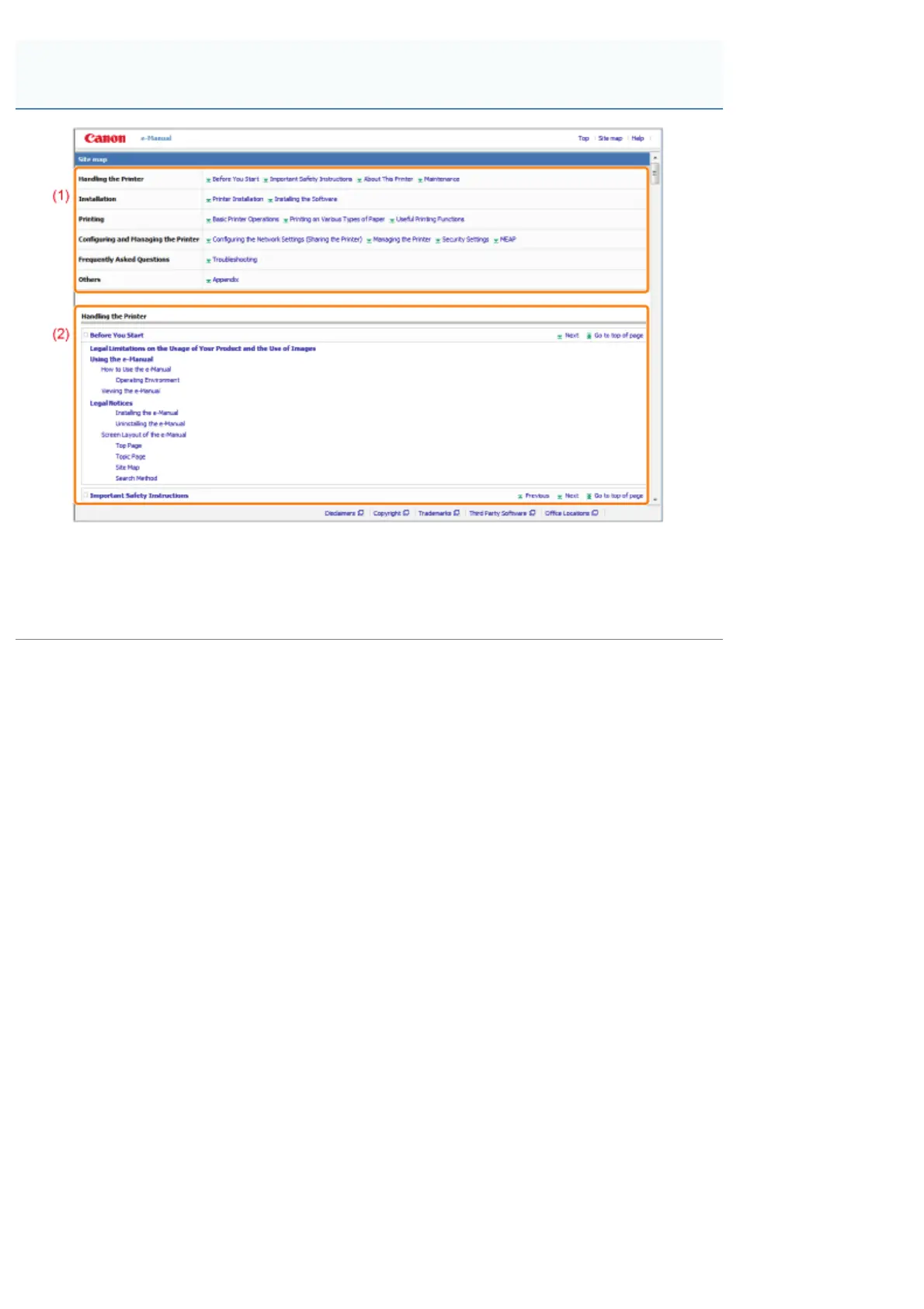 Shows the all chapters and sections of the e-Manual. Click an item to view the contents.