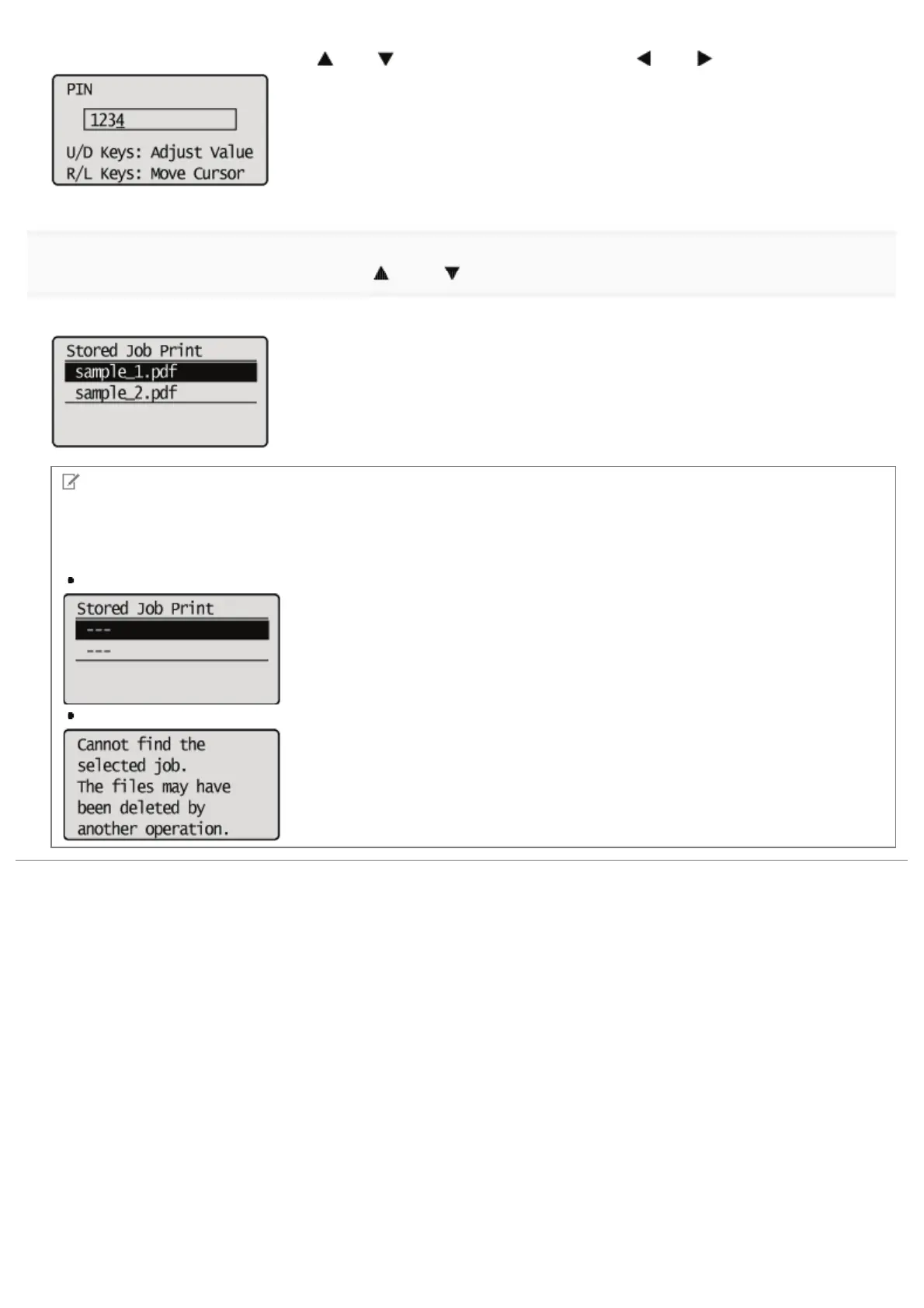 If the stored job has been deleted by an external operation, for example an operation from the Remote UI, a screen such