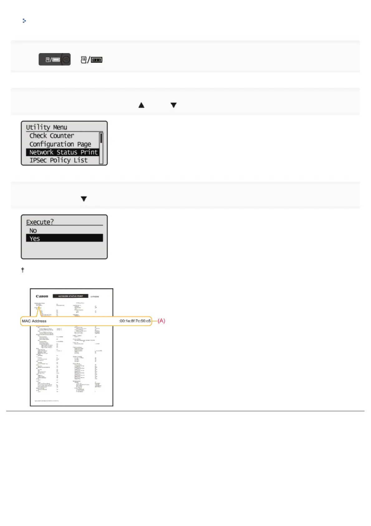 Network Status Print is printed. The MAC address (A) is indicated in [Ethernet Driver Settings] on the upper left of the