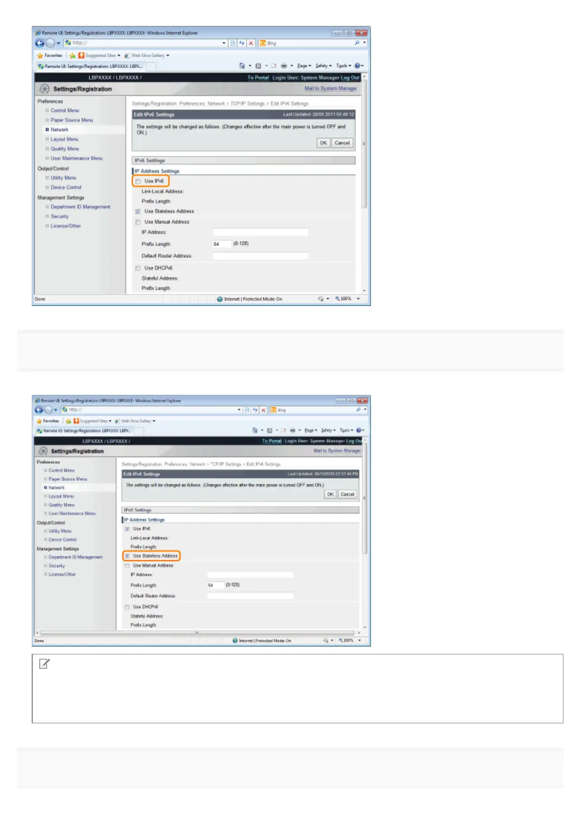 After the [Use Stateless Address] check box is selected and the printer is restarted, the stateless address is displayed