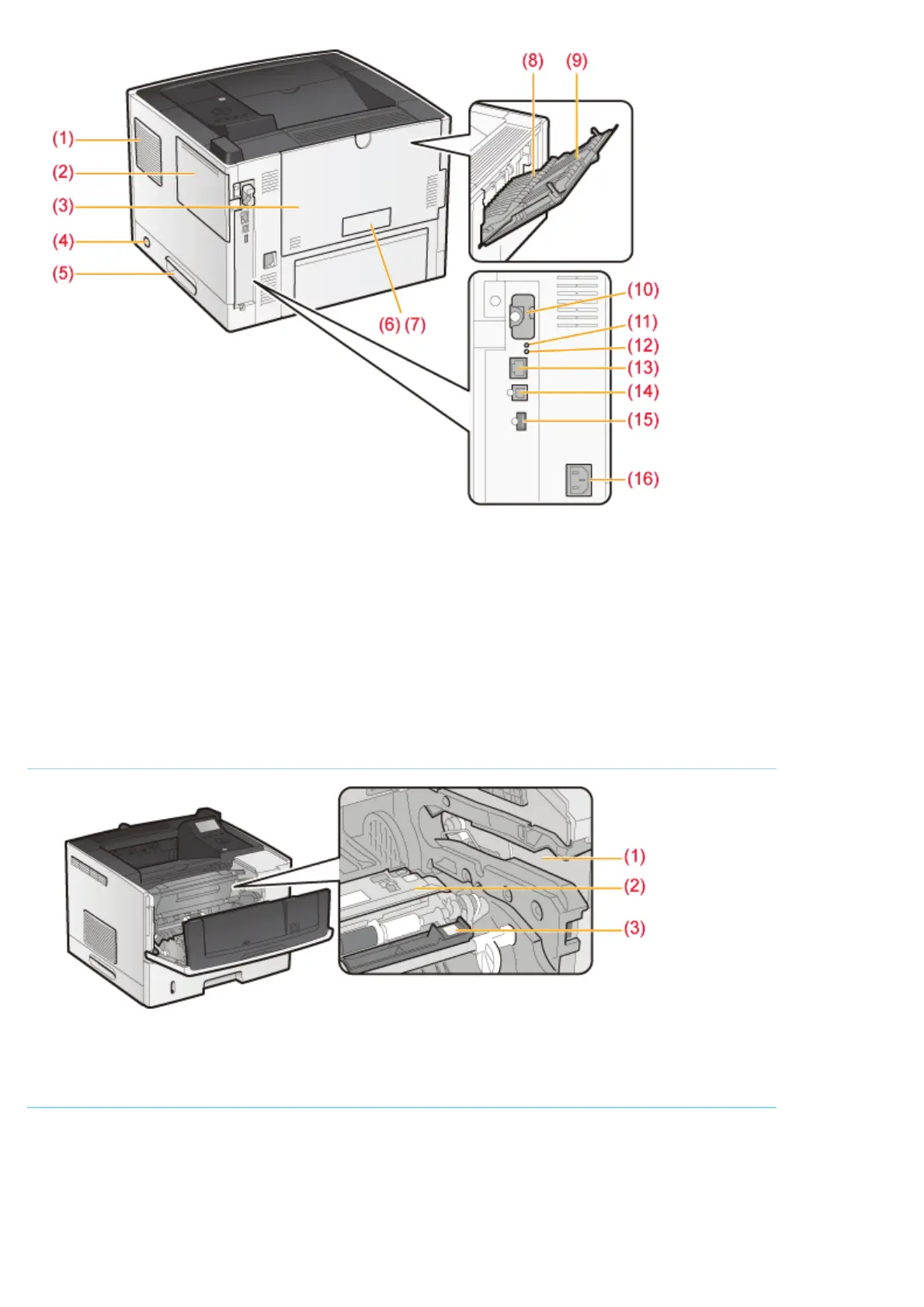 (1) Toner Cartridge Guide (2) Transfer Guide at the back (3) Transfer Guide at the front