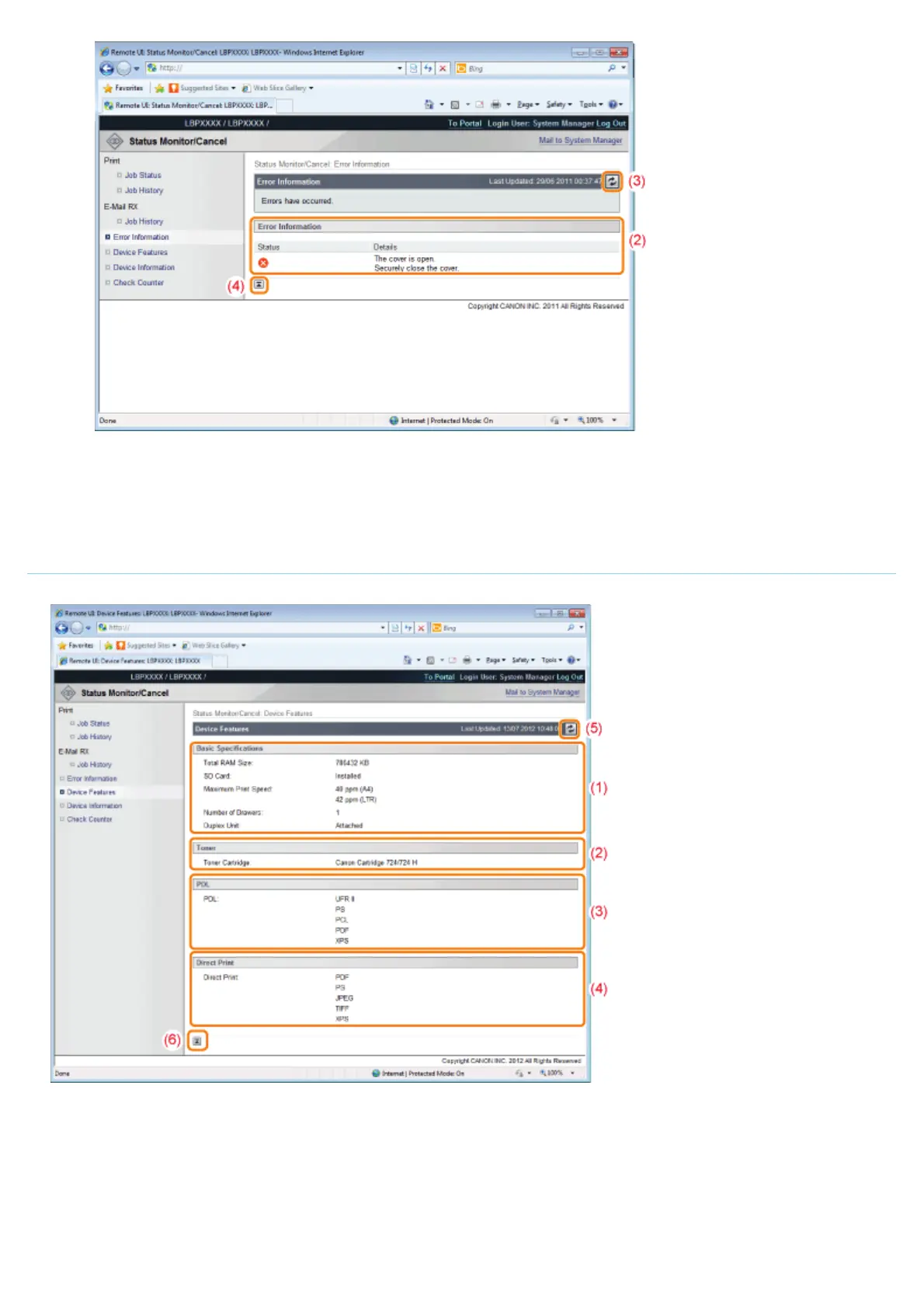 Information about the toner cartridges installed in the printer is displayed.