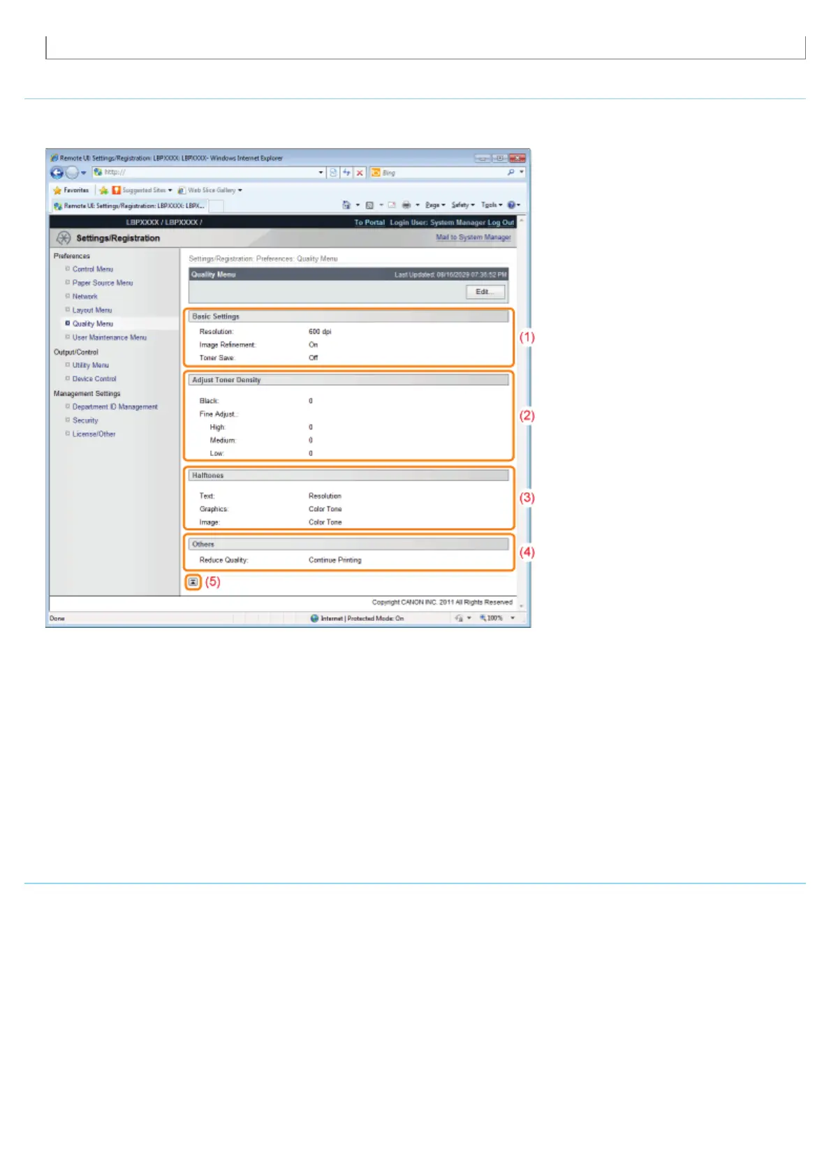 It displays the settings for printer adjustment from a specified paper source if a problem occurs, such as adjustment of print