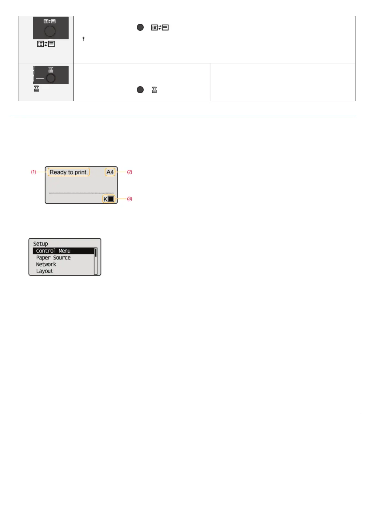 The display on the printer's control panel is as shown in the following. It displays the printer status, messages, items and settings of the menu