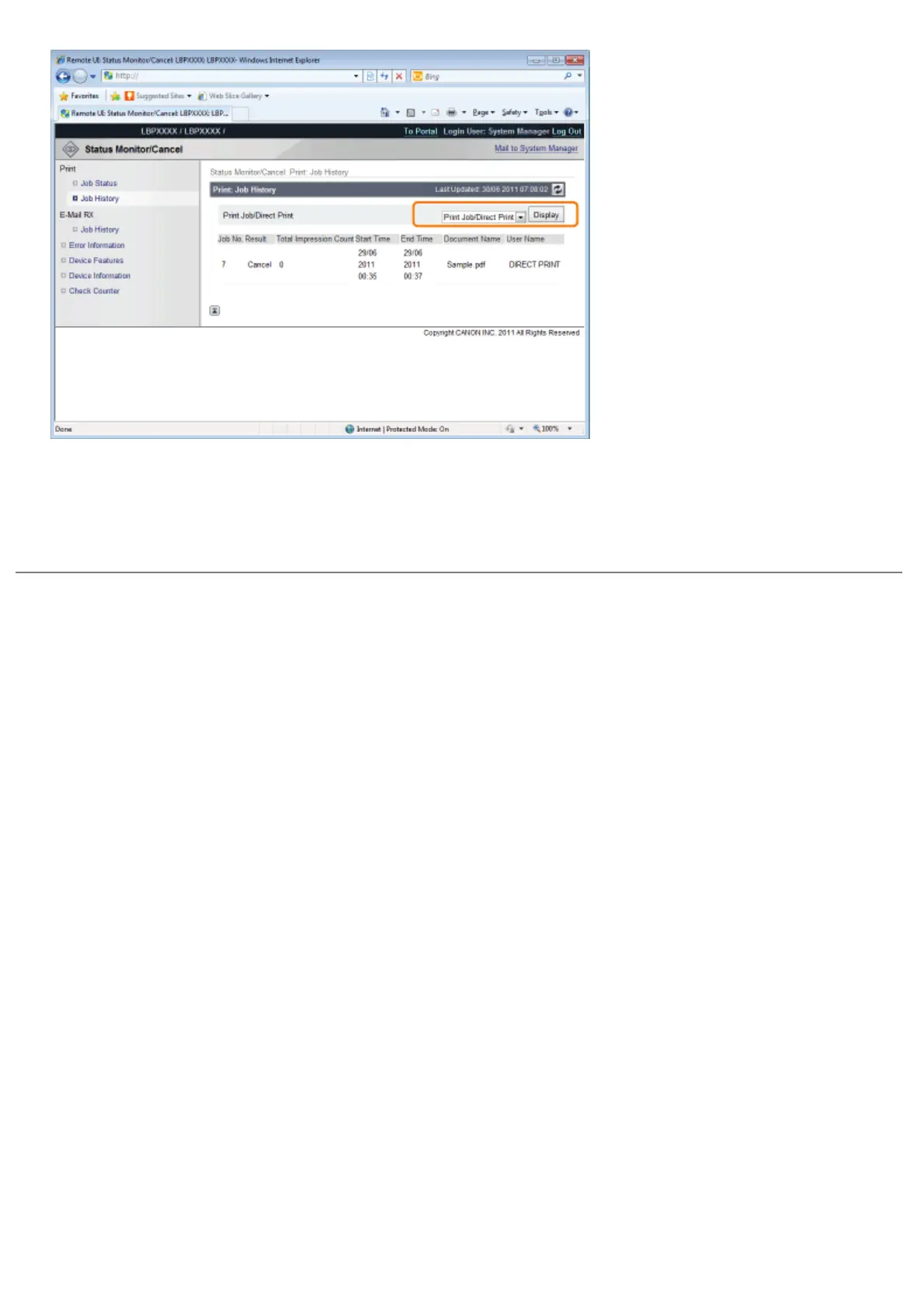 [Print Job/Direct Print]: The printed job history is displayed from the computer.