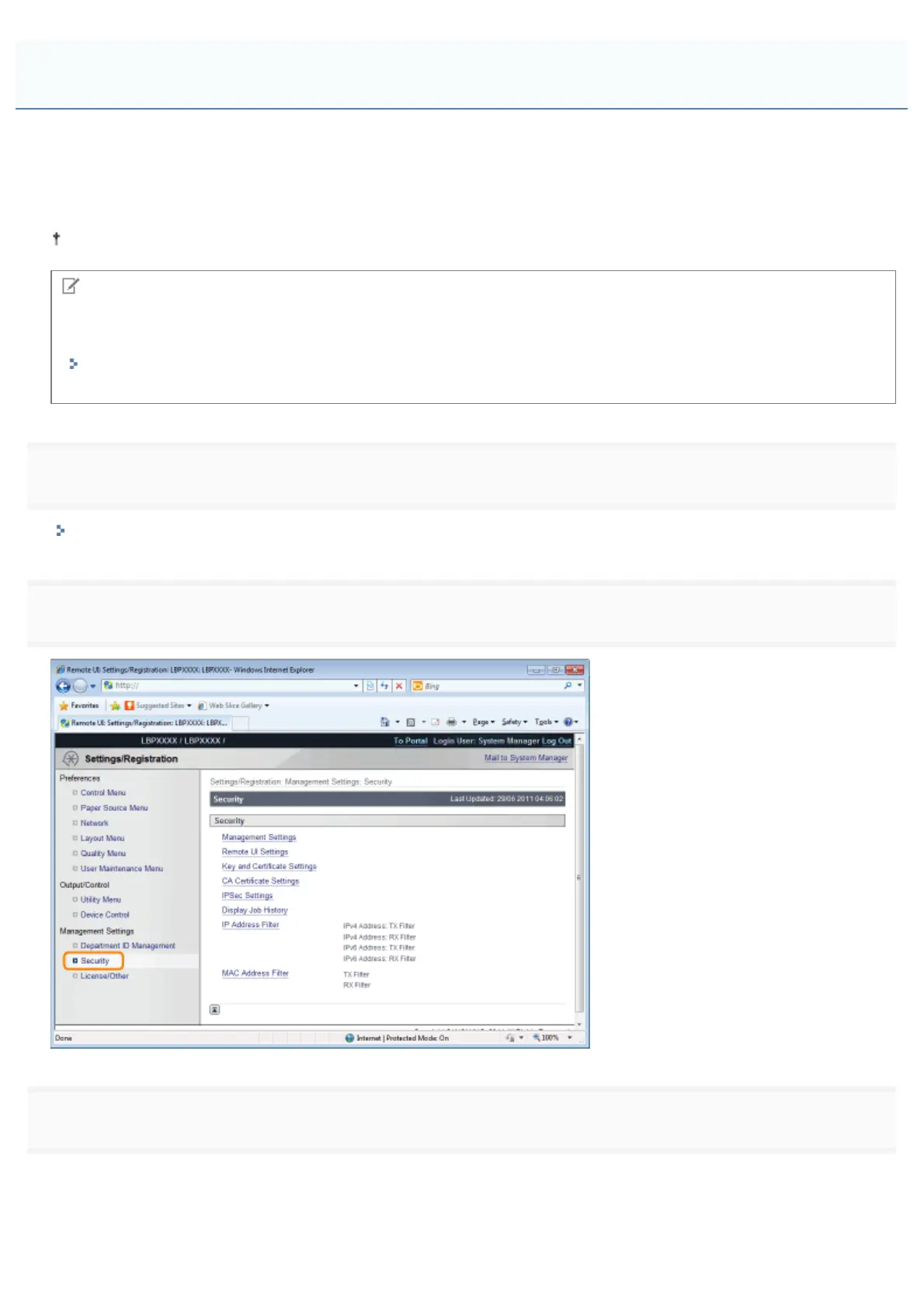 Select [Security] under [Management Settings] in the [Settings/Registration] menu.