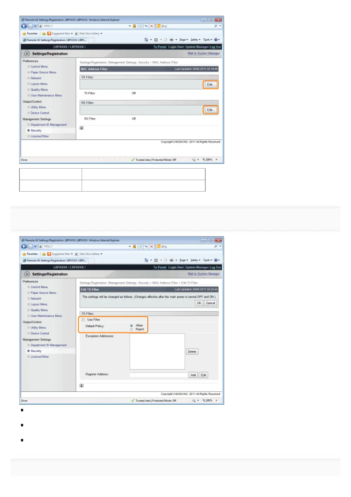 If you select [Allow], you will only be able to transmit or print from users (clients) entered in the [Exception Addresses]