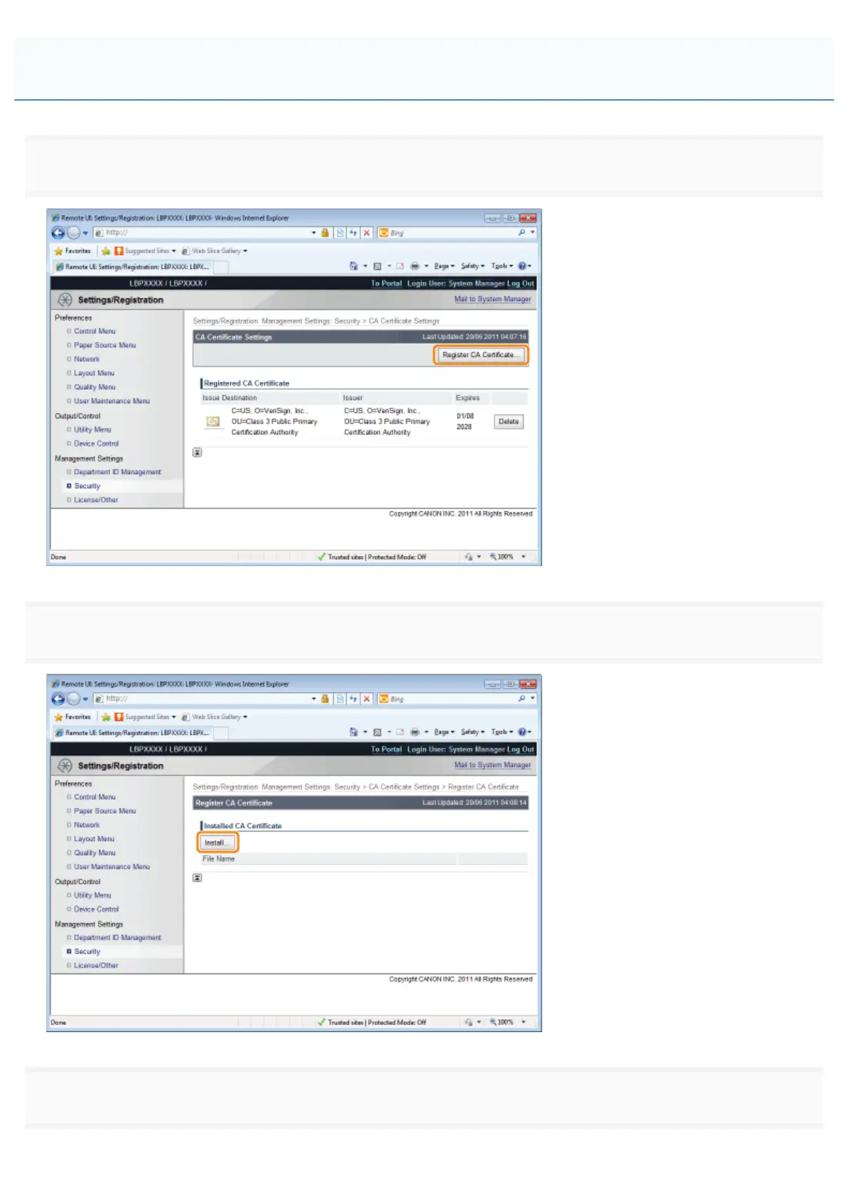 Canon LBP6780x - Installing CA Certificate Files on the Printer