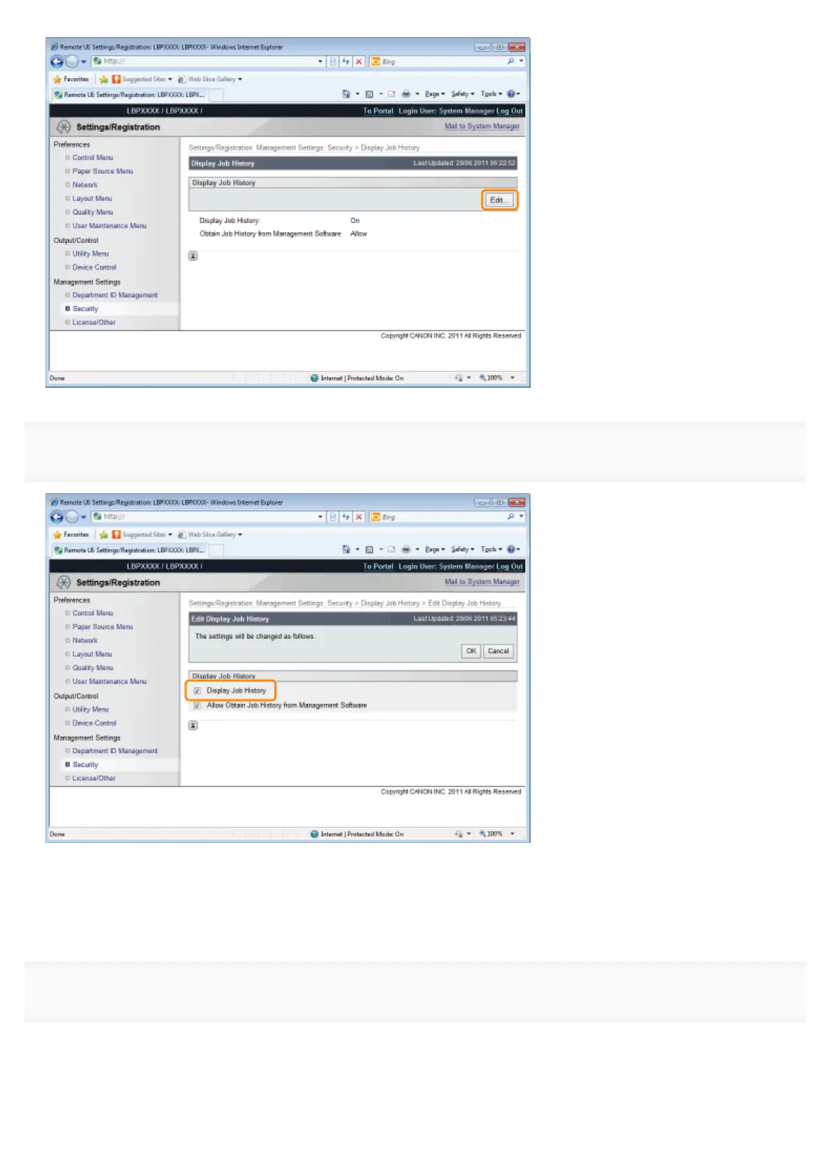 The [Job History] page in the [Status Monitor/Cancel] menu