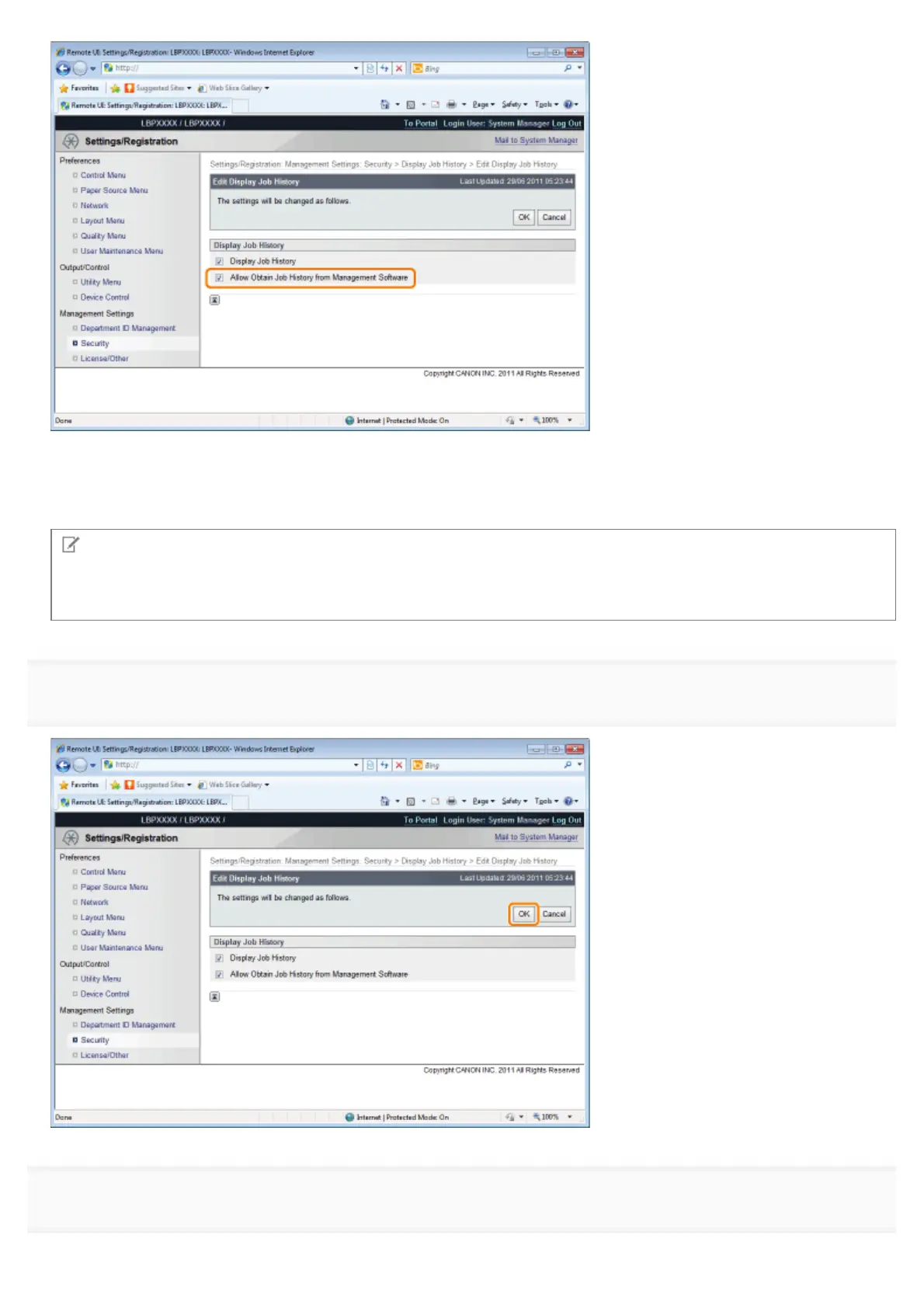 If the [Allow Obtain Job History from Management Software] check box is cleared, job logs cannot be obtained from
